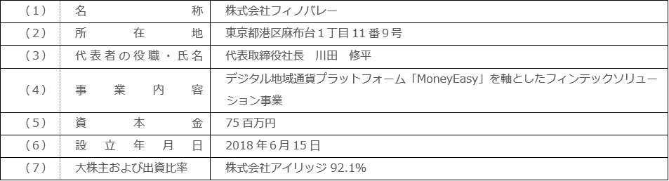 株式会社アイリッジ(本社:東京都港区、代表取締役社長:小田 健太郎、東京証券取引所マザーズ:3917、以下「アイリッジ」)の連結子会社でフィンテック事業を展開する株式会社フィノバレー(本社:東京都港区、代表取締役社長:川田 修平、以下「フィノバレー」)は、三菱電機株式会社(本社:東京都千代田区、代表執行役 執行役社長:漆間 啓、以下「三菱電機」)とデジタル地域通貨事業及びスマートシティ/スーパーシティ事業に関する事業協業契約を締結し、三菱電機を割当先とする第三者割当増資を実施することを発表します。
