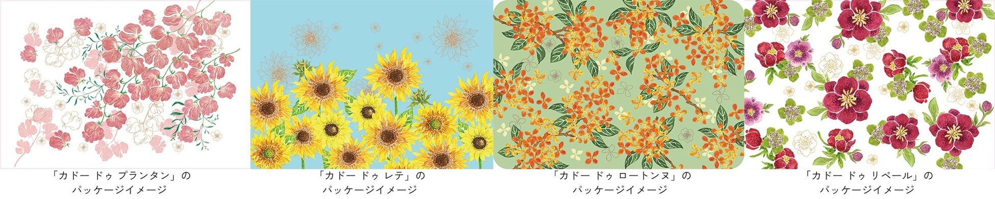 季節限定クッキー缶「カドーシリーズ」において、日比谷花壇とパッケージコラボレーションをした商品を展開します。「カドーシリーズ」は“お花を贈るような気持ちでお菓子を贈る”をコンセプトに、パッケージに四季折々の花を描いた詰め合わせ商品です。春はスイートピー、夏はひまわり、秋はキンモクセイ、冬はクリスマスローズの季節の花をパッケージにあしらいました。2021年より販売を始め、これまで多くの方にご愛顧頂いた「カドーシリーズ」。お菓子とお花の力で人と人との関係性を深めたい、という想いを込めてリニューアルしました。
