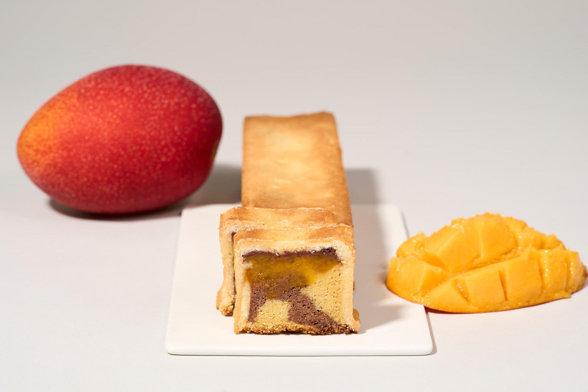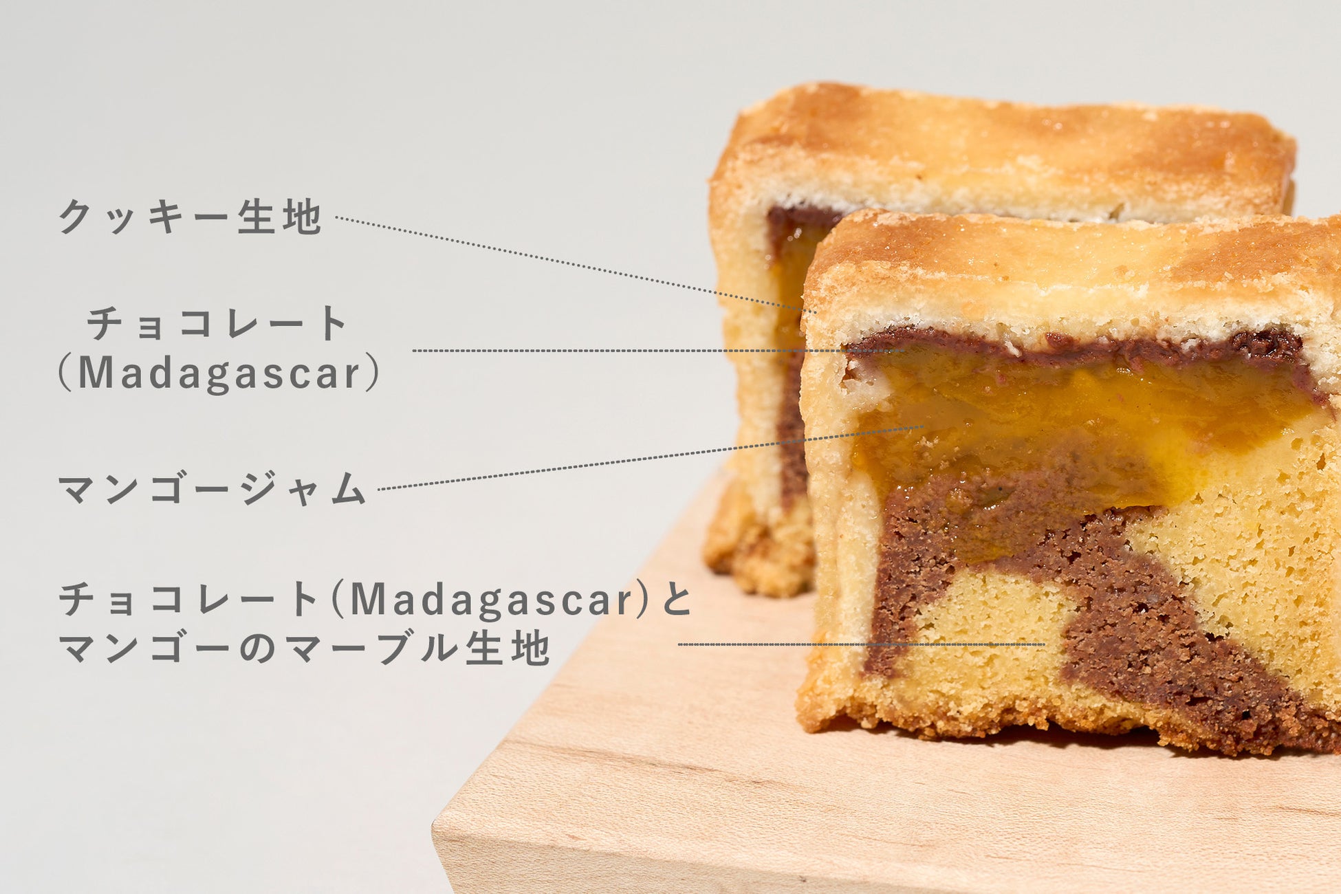 宮崎マンゴーのピューレと、マンゴーキャラメルを練り込んだ特製マンゴー生地と、マンゴー生地にマダガスカル産カカオのチョコレートを加えたチョコレート生地をマーブル状に合わせ、チョコレートとマンゴーの一体感を引き出しました。