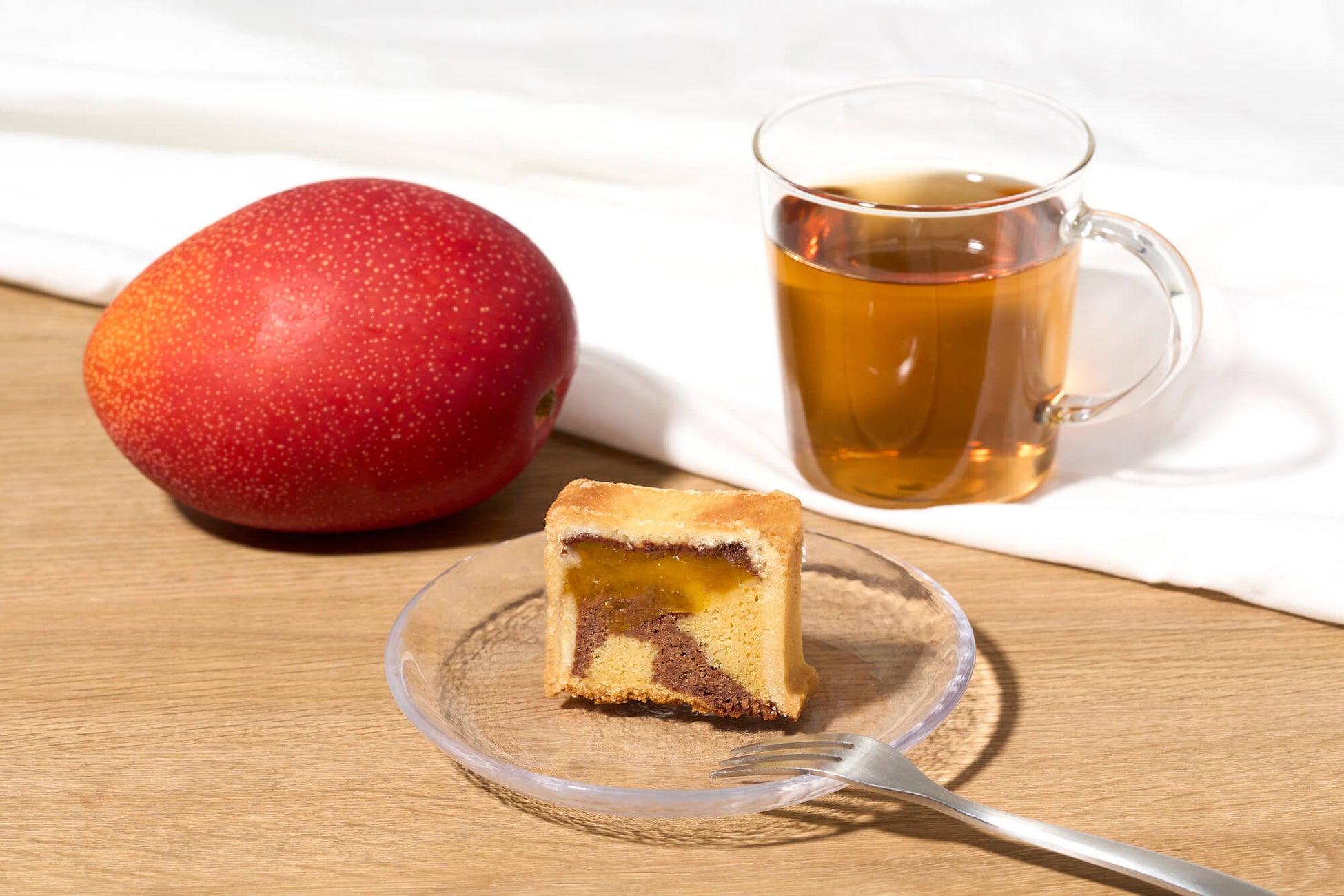 ザクッとしたバター香るクッキー生地で、完熟マンゴージャムと、チョコレートとマンゴーのマーブル生地を包み焼き上げました。まるで台湾の人気菓子“パイナップルケーキ”のようなガトーショコラであり、これまでにないアプローチで仕立てた新たな夏スイーツです。