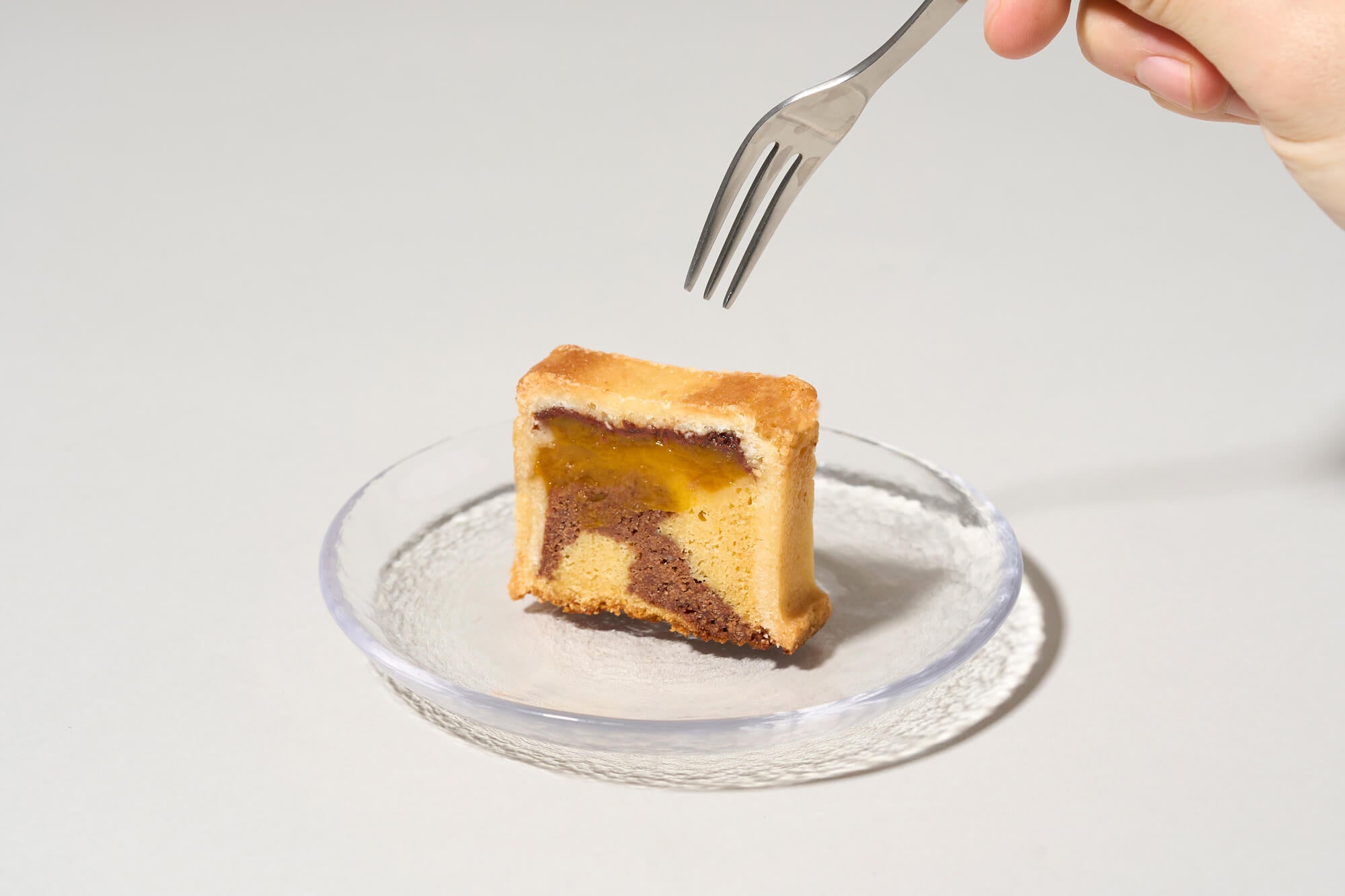 宮崎マンゴーのピューレと、マンゴーキャラメルを練り込んだ特製マンゴー生地と、マンゴー生地にマダガスカル産カカオのチョコレートを加えたチョコレート生地をマーブル状に合わせ、チョコレートとマンゴーの一体感を引き出しました。