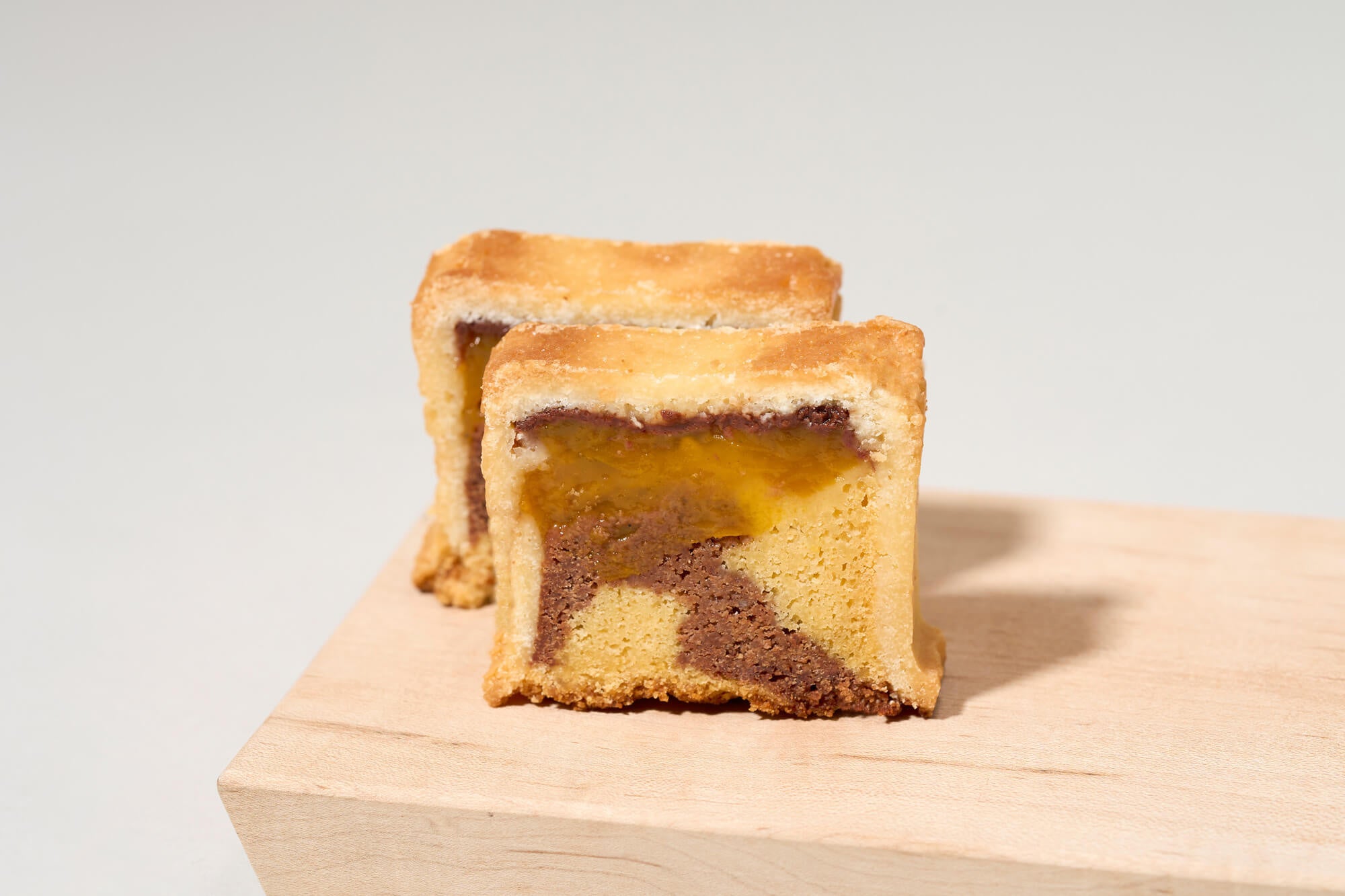 ザクッとしたバター香るクッキー生地で、完熟マンゴージャムと、チョコレートとマンゴーのマーブル生地を包み焼き上げました。まるで台湾の人気菓子“パイナップルケーキ”のようなガトーショコラであり、これまでにないアプローチで仕立てた新たな夏スイーツです。
