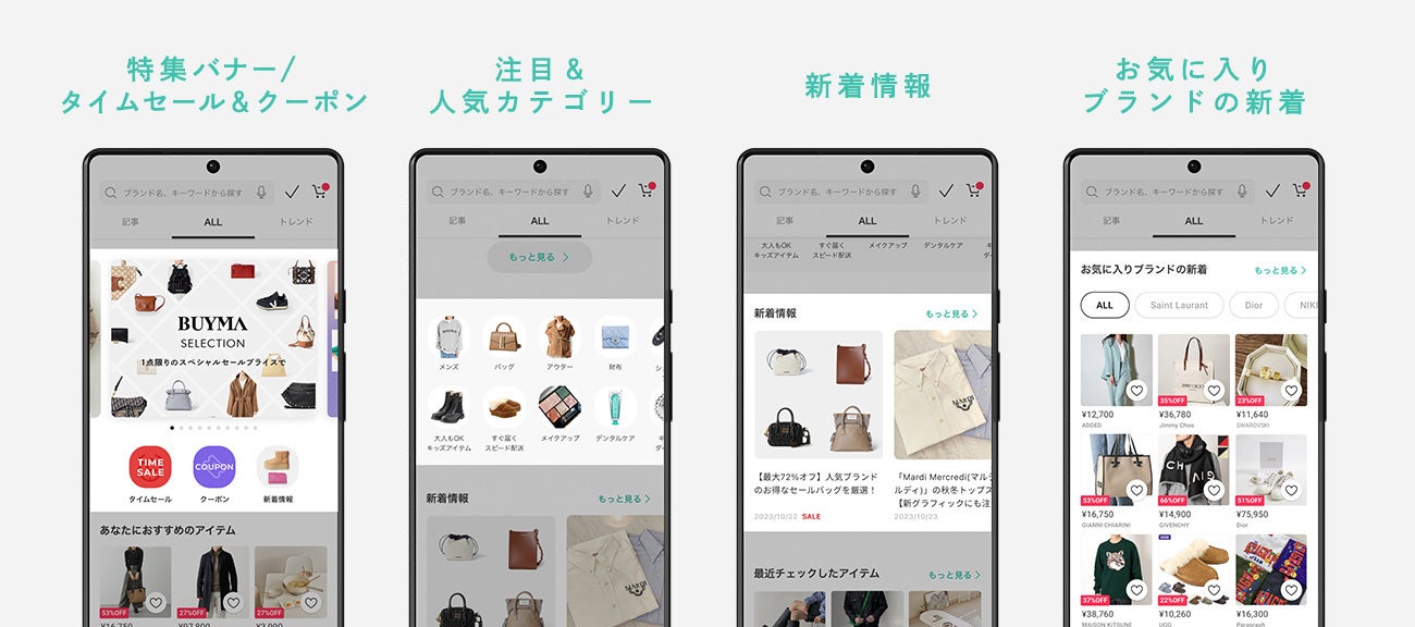 ・バナー下に、期間限定のタイムセール商品と今使えるお得なクーポン、BUYMAで人気の商品や注目のブランドを紹介する新着情報の導線を追加しました。