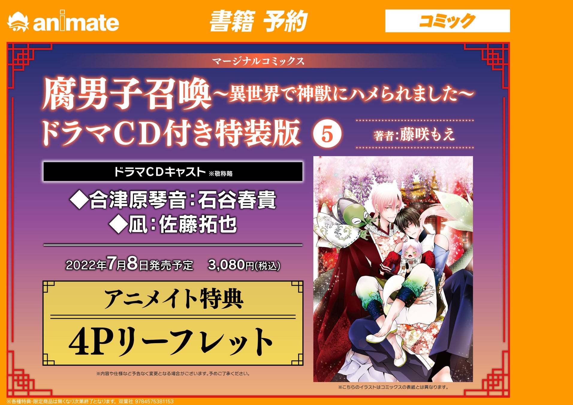 2021年4月に発売となった『腐男子召喚~異世界で神獣にハメられました~』第3巻ドラマCD付き特装版は、豪華キャストと作品の人気、話題性が噛み合い、各地で売切れが続出する大ヒットとなりました。ファンの皆様からの熱望の声にお応えして、2022年7月8日発売の『腐男子召喚~異世界で神獣にハメられました~』第5巻は通常版に加え、ドラマCD付き特装版の発売が決定いたしました。