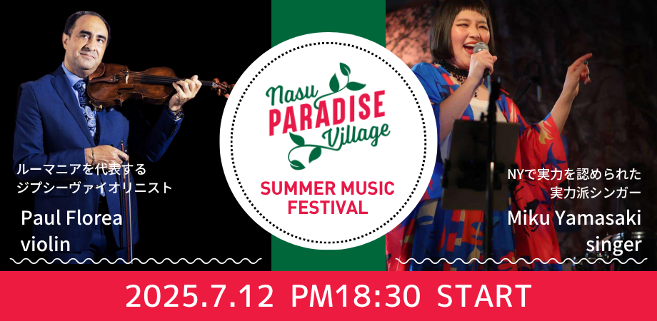 那須パラダイスヴィレッジでは、7月〜9月の間、月一で実力派ミュージシャンをお迎えし、那須の大自然に包まれた空間で、極上の心に響く時間を提供いたします。