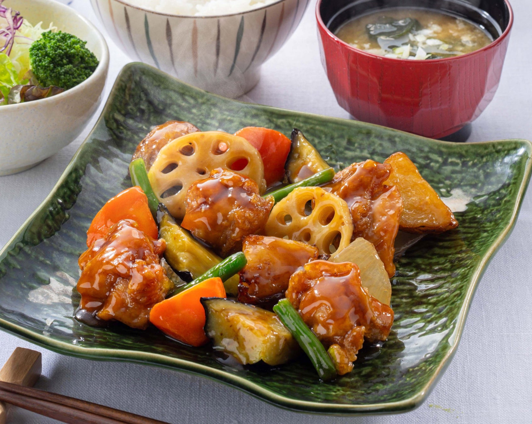 不動の⼈気No.1メニュー!⽞⽶黒酢と黒糖に、りんご酢で味を調えた、⼤⼾屋オリジナルの黒酢あん。