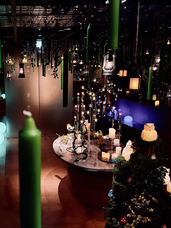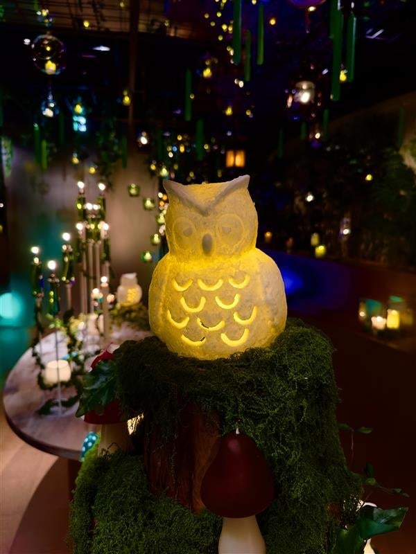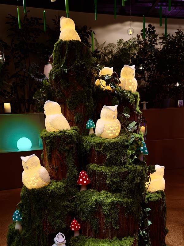 一歩中に入ると、そこはまるでおとぎ話に出てくる森の中。ロウでできたフクロウや、ユニークで可愛らしい毒キノコ、実際に亀山市内の森から届いたヒノキの切り株などが森の雰囲気を演出。さらに、ローソクタウンストアで販売中のキャンドル、LEDキャンドル、ランタンなどが織りなす多彩な灯りが、まるで物語の中に迷い込んだかのような美しい情景を創り出します。