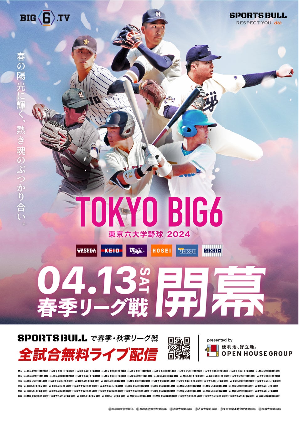 株式会社運動通信社(本社:東京都港区、代表取締役:⿊⾶功⼆朗)と株式会社スポーツマーケティングラボラトリー(本社:東京都港区、代表取締役:荒⽊重雄)は、⼀般財団法⼈東京六⼤学野球連盟(以下「同連盟」)公認のもと、同連盟が主催する東京六⼤学野球2024リーグ戦について、運動通信社が運営するスポーツメディア「SPORTS BULL(スポーツブル)」内の「BIG6.TV(ビッグシックスティービー)」(https://sportsbull.jp/category/big6tv/)にて、4月13日の開幕戦より全試合無料ライブ配信します。