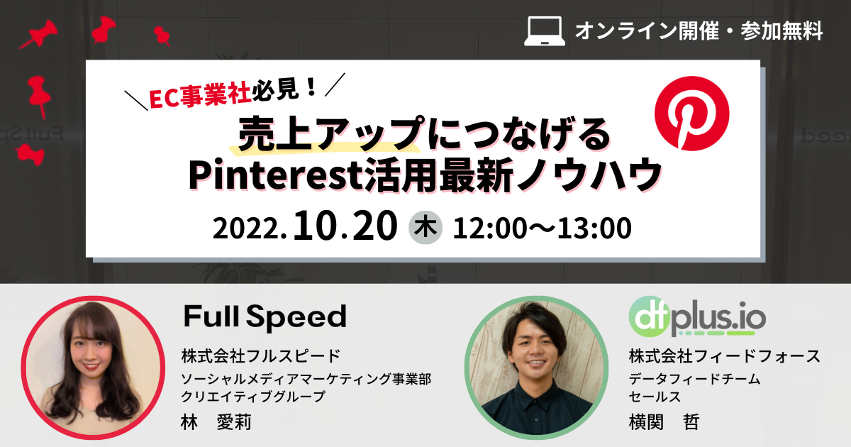 SNSをはじめとするインターネットマーケティング支援を行う株式会社フルスピードは、データフィードマーケティング支援を行う株式会社フィードフォースとの共催で、「EC事業社必見!売上アップにつなげるPinterest活用最新ノウハウ」と題した無料オンラインセミナーを2022年10月20日(木)12時より開催いたします。