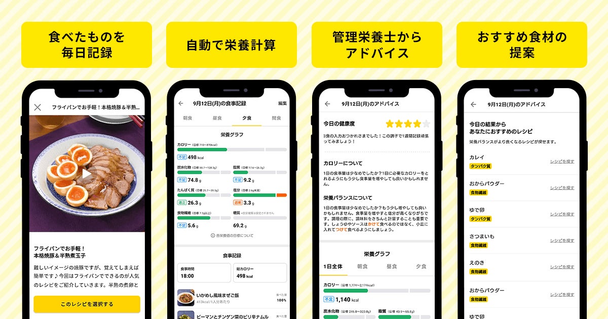 『DELISH KITCHEN』では、健康情報や食事記録に基づいて、栄養計算・管理栄養士によるアドバイス・おすすめ食材の提案などが受けられる、ヘルスケア機能も提供しており、管理栄養士の健康アドバイスやおすすめ食材から、『DELISH KITCHEN』のレシピを検索することもできます。さらに、プレミアム会員になると1食ごとのアドバイスが受けられたり、足りない栄養素を自動でグラフ化して見ることができたりと、ワンランク上の健康サポートを受けることも可能です。また、プレミアムサービスでは、「糖質オフ」「塩分控えめ」といったお悩み別の限定レシピも公開しており、幅広く栄養管理のサポートを行っています。