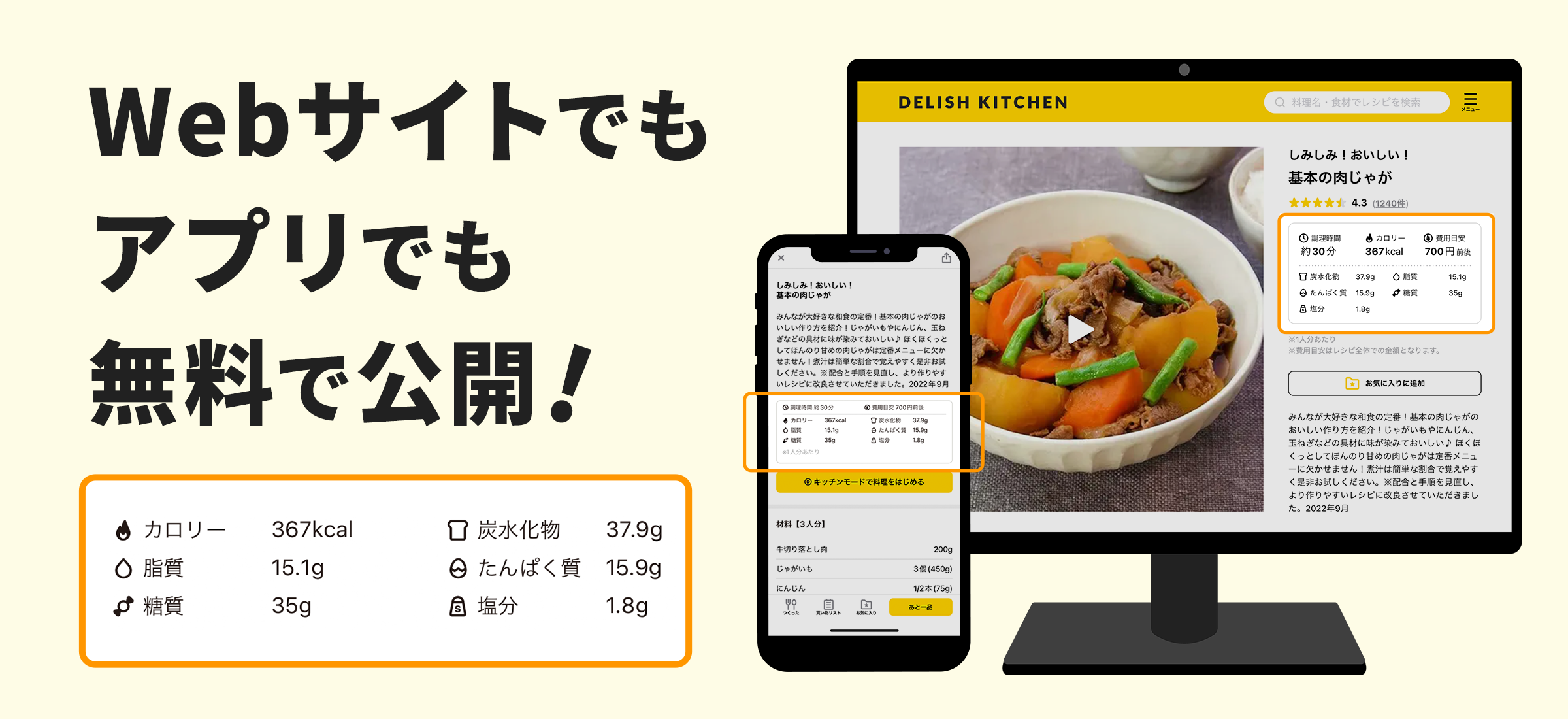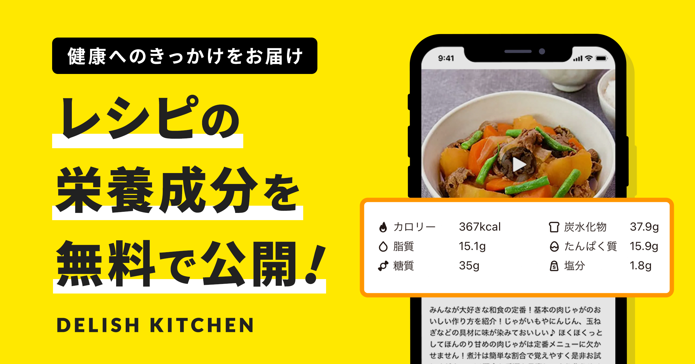 そこで『DELISH KITCHEN』では、栄養成分を公開することで栄養バランスが考えられた食生活を送るきっかけを提供したいと考え、これまで公開していたカロリー情報に加えて、炭水化物、脂質、たんぱく質、糖質、塩分のデータを無料で公開いたします。データは、『DELISH KITCHEN』のウェブサイト、アプリのどちらからでも閲覧可能です。