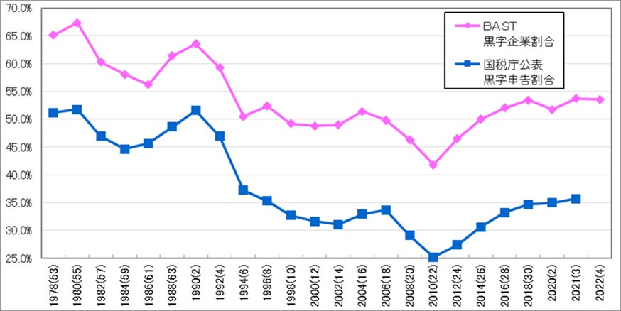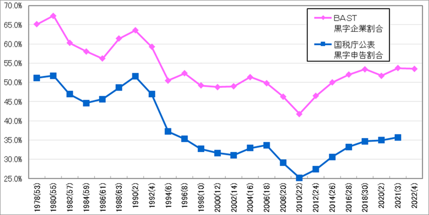 ※1「BAST黒字企業割合」は、「TKC経営指標(BAST)」の「収録件数」及び「黒字件数」を基に計算しています。なお、「TKC経営指標(BAST)」の「黒字企業」とは、「期末純資産」及び「税引前当期損益」が、いずれもプラスである企業をいいます。