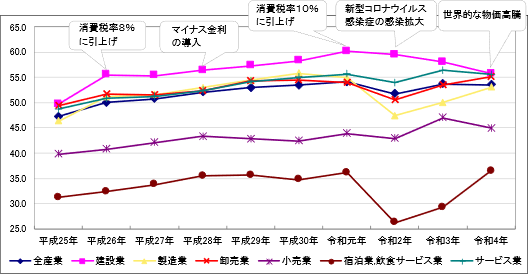 産業別に見ると、建設業の黒字企業割合がすべての産業で最も高いものの、前年の58.1%から2.3ポイント低下し、すべての産業の中で唯一、3年連続の低下となりました。また、黒字企業割合が最も上昇したのは宿泊業、飲食サービス業で、前年から7.1ポイント上昇し、コロナ禍前の水準に回復しました。