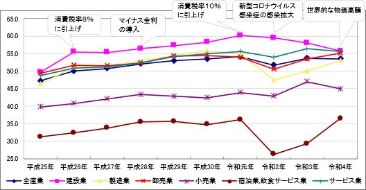 2022年の全産業の黒字企業割合は、前年の53.7%から0.2ポイント低下して53.5%でした。