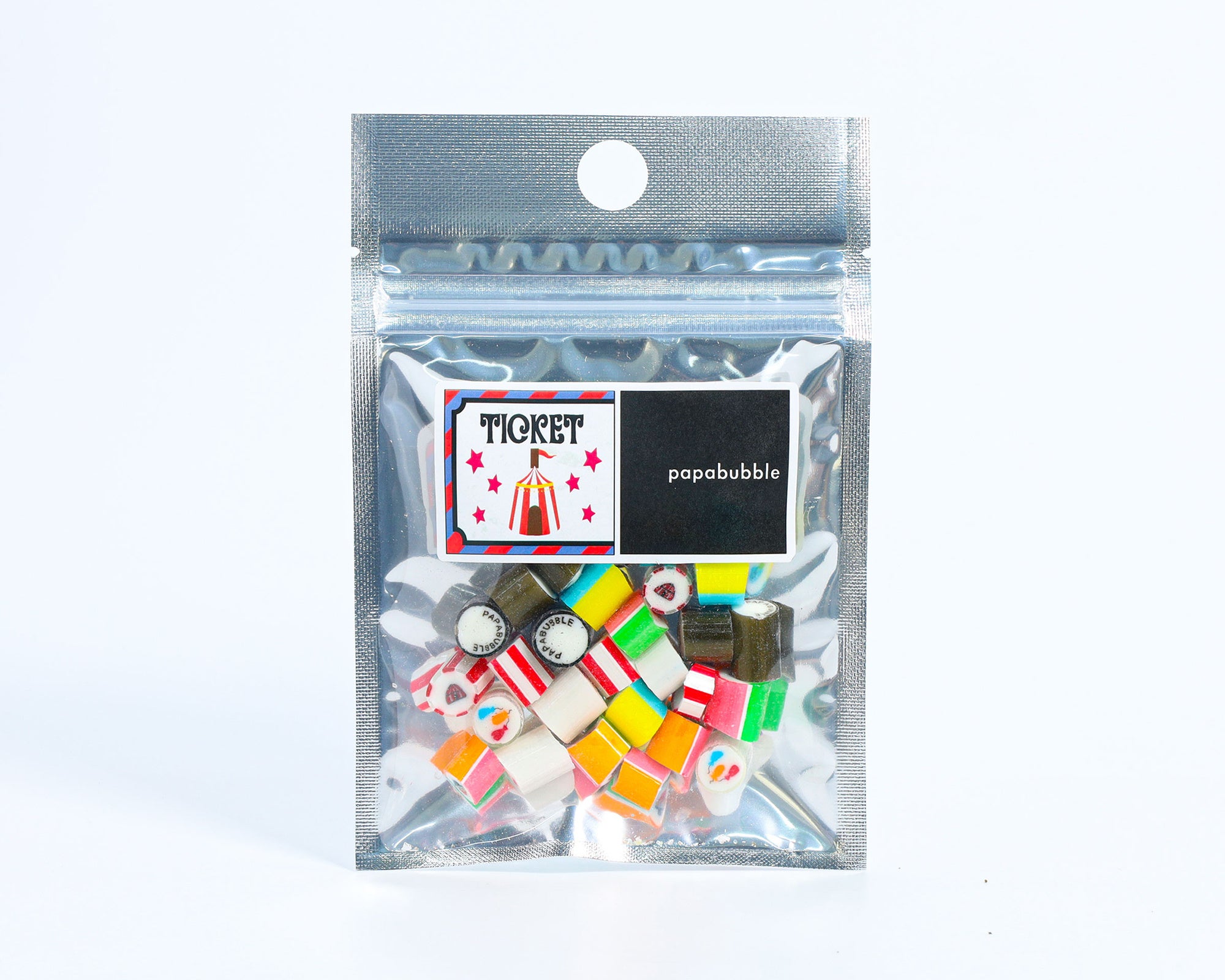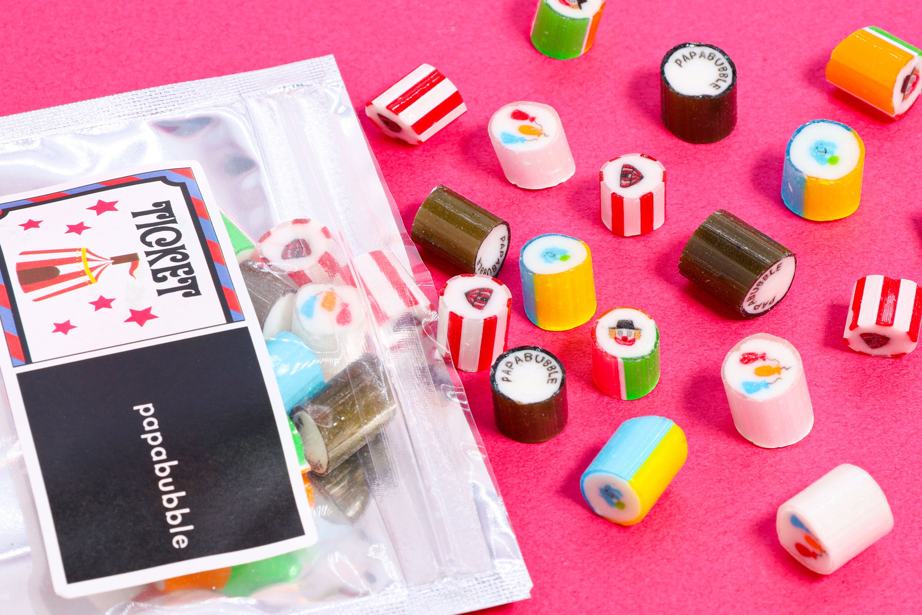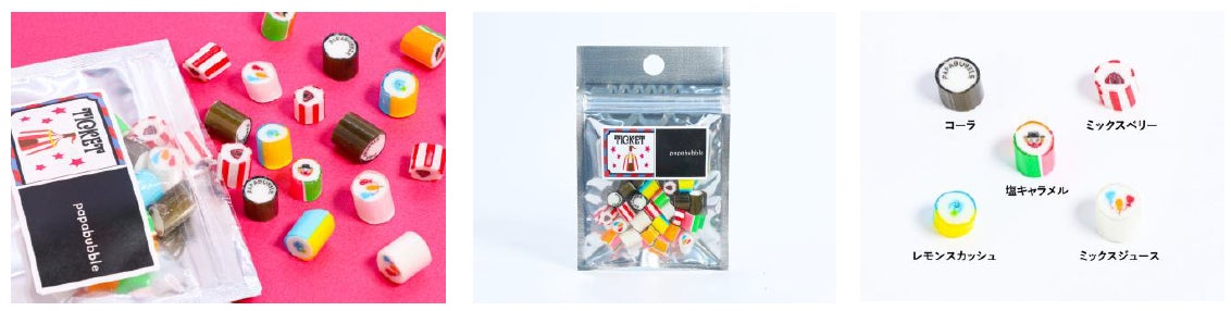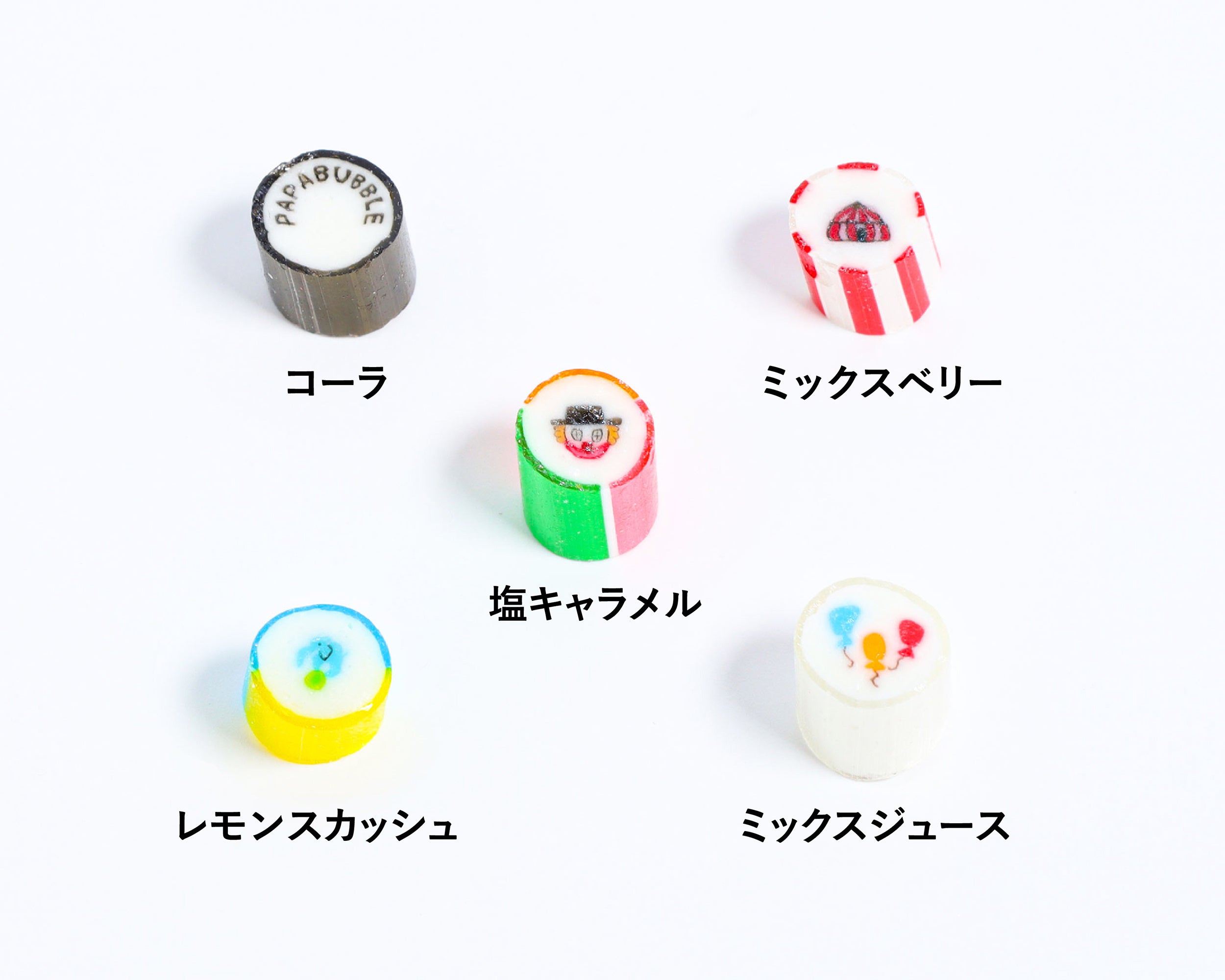 パパブブレのキャンディ実演は、まるでサーカスのようなエンターテイメントショーです。ワクワクする感覚をキャンディでも味わってもらいたいという思いで、「玉乗りゾウさん」や「ピエロ」の柄など、サーカスをモチーフにしたキャンディをご用意しました。フレーバーは塩キャラメルやレモンスカッシュなど、ワクワク感を高める人気の限定フレーバーを選びました。