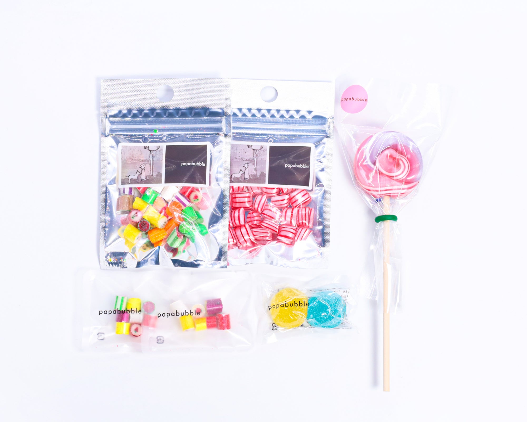 催事限定でオリジナルデザインのトートバッグセットを販売。パパブブレ定番の「フルーツミックス」やロングセラーフレーバーの「コーラキャンディ」、誰もが一度は憧れるロリポップキャンディ(Sサイズ)と人気のグミ「バブレッツ」の詰め合わせセットです。