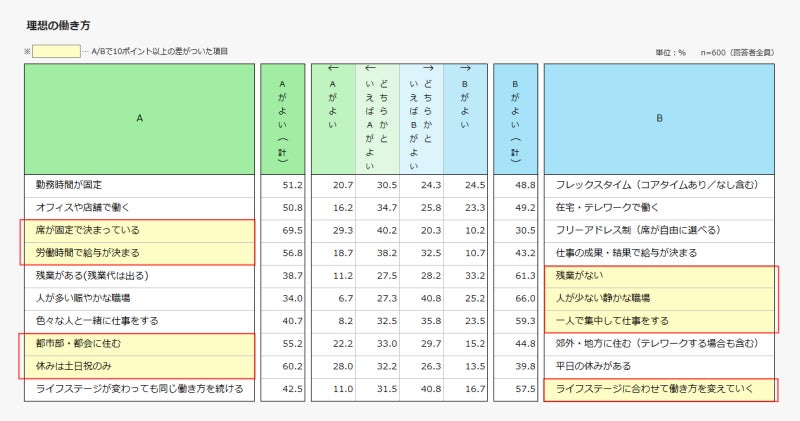 ・フリーアドレスよりも固定席、人が多い賑やかな職場よりも静かな職場を理想とする人の方が多い