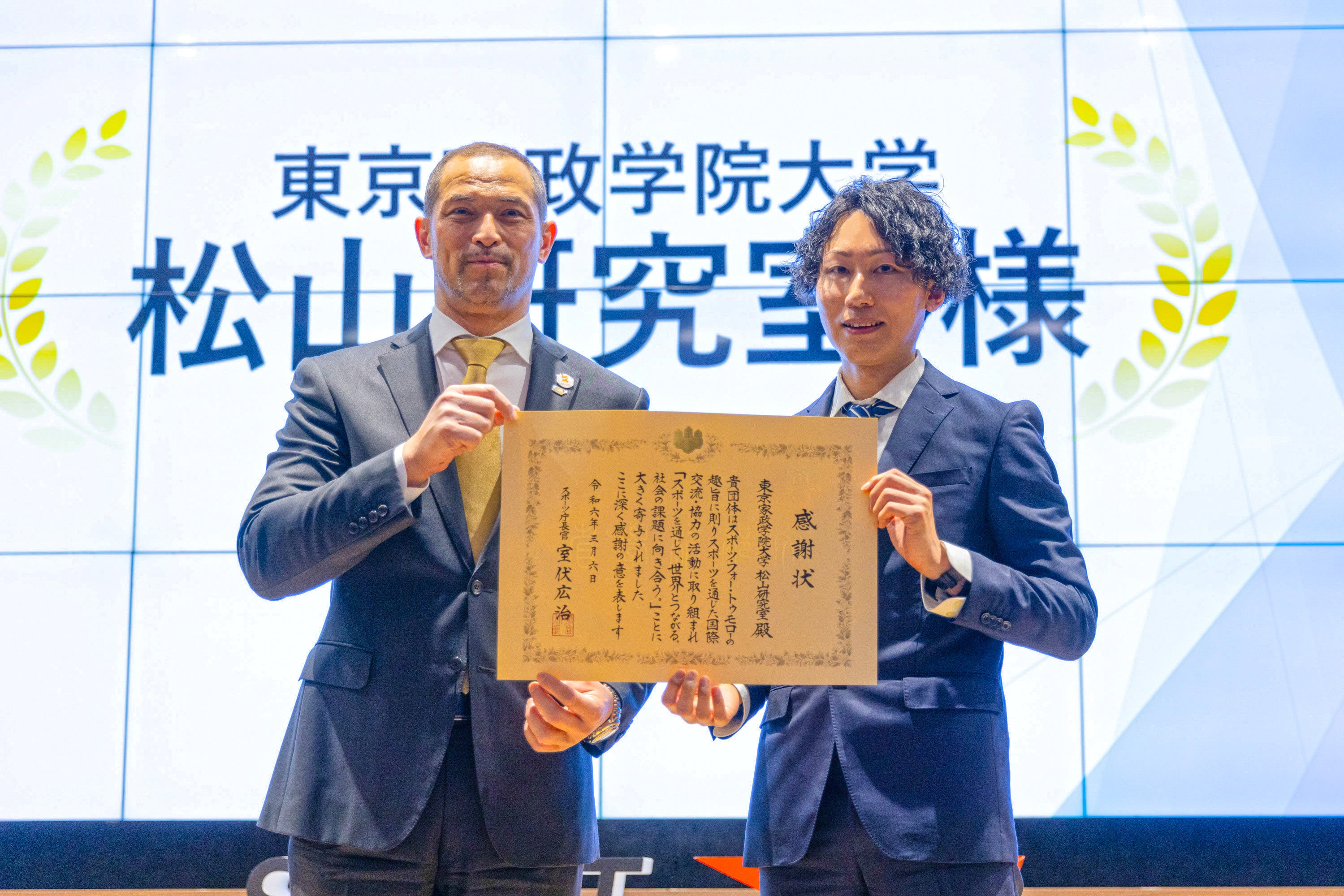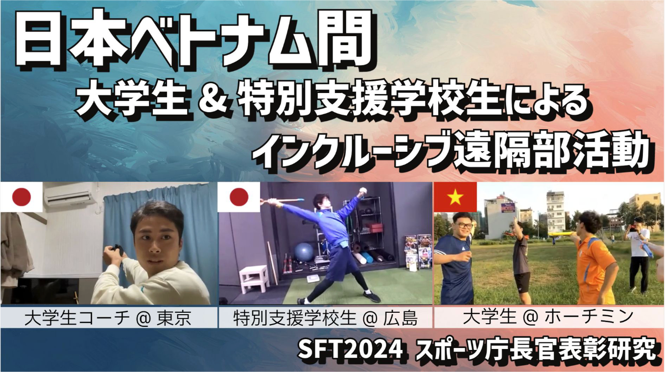 遠隔部活動研究の一環として、松山直輝助教が取り組む「日本・ベトナム間、大学生・特別支援学校生によるインクルーシブ遠隔部活動の実践!」が、2024年3月6日に開催されたSport For Tomorrow Conference 2024(以下、SFT2024)においてスポーツ庁と日本スポーツ振興センターからスポーツ国際貢献活動に対する先駆性・汎用性が高く評価され、スポーツ庁 室伏広治 長官より表彰を受けた。表彰を受けた取り組みは将来、クラウドファンディングのリターン商品へ応用される可能性がある。