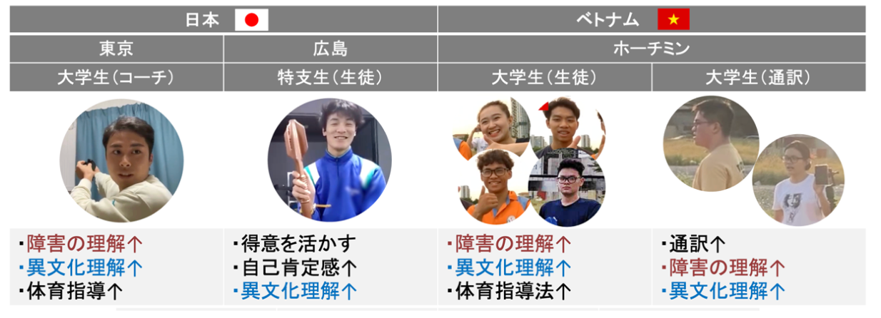 例えば、体育教師を目指す大学生コーチにとって、この場は障害の理解や異文化理解、そして体育の指導力を向上させるトレーニングの機会となった。やり投げを得意とする特別支援学校生は指導に参画し、この協働的な活動か働的な活動から自己肯定感を高め、そして異文化理解を深める場となった。ホーチミン市師範大学体育学部の大学生は、ベトナムでメジャースポーツではないやり投げの指導法について学び、体育指導の知見を深める場となった。日本語学部の学生にとっては、スポーツ通訳を通じた実践的なトレーニングの場となった。