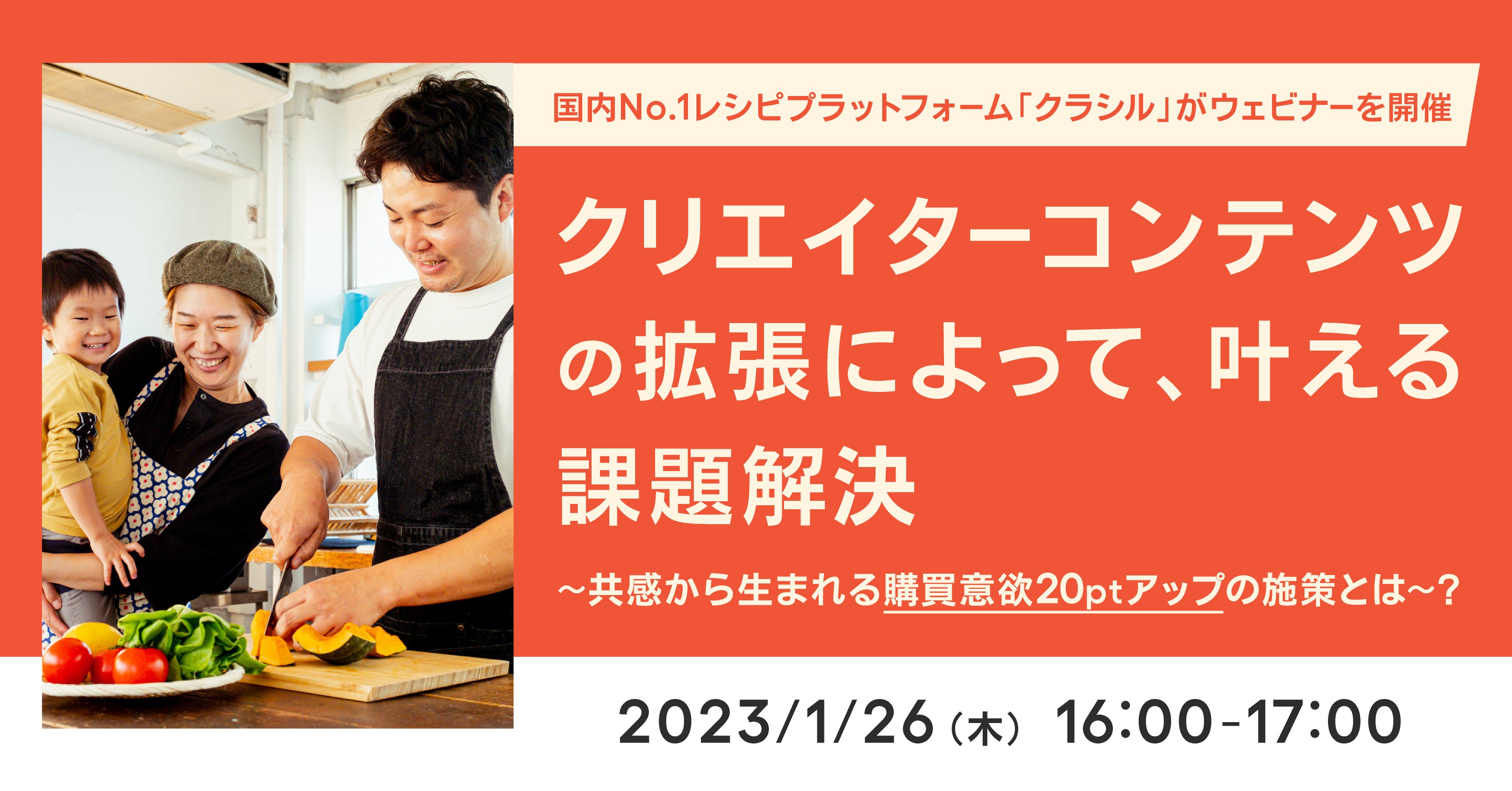 月間利用者数5,600万人を誇る国内No.1のレシピプラットフォーム「クラシル」(※1)は、2023年1月26日(木)16:00〜17:00に『クリエイターコンテンツの拡張によって、叶える課題解決』について無料のウェビナーを開催します。