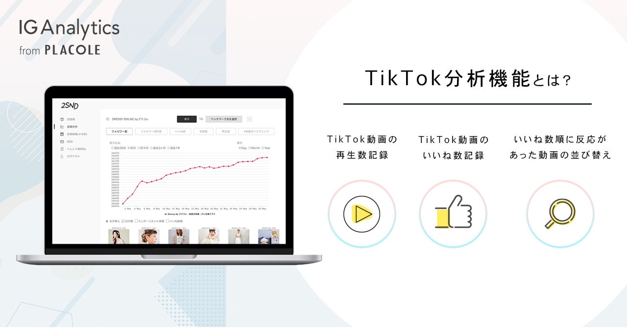 「PLACOLE & DRESSY」ブランドを展開する、冒険社プラコレ(本社:神奈川県鎌倉市、代表取締役CEO:武藤功樹)は、 Instagramの投稿分析ツール「IG Analytics」に現在注目のショート動画・TikTok運用の配信動画を分析する、「TikTok分析機能」をリリースしたことをお知らせいたします。