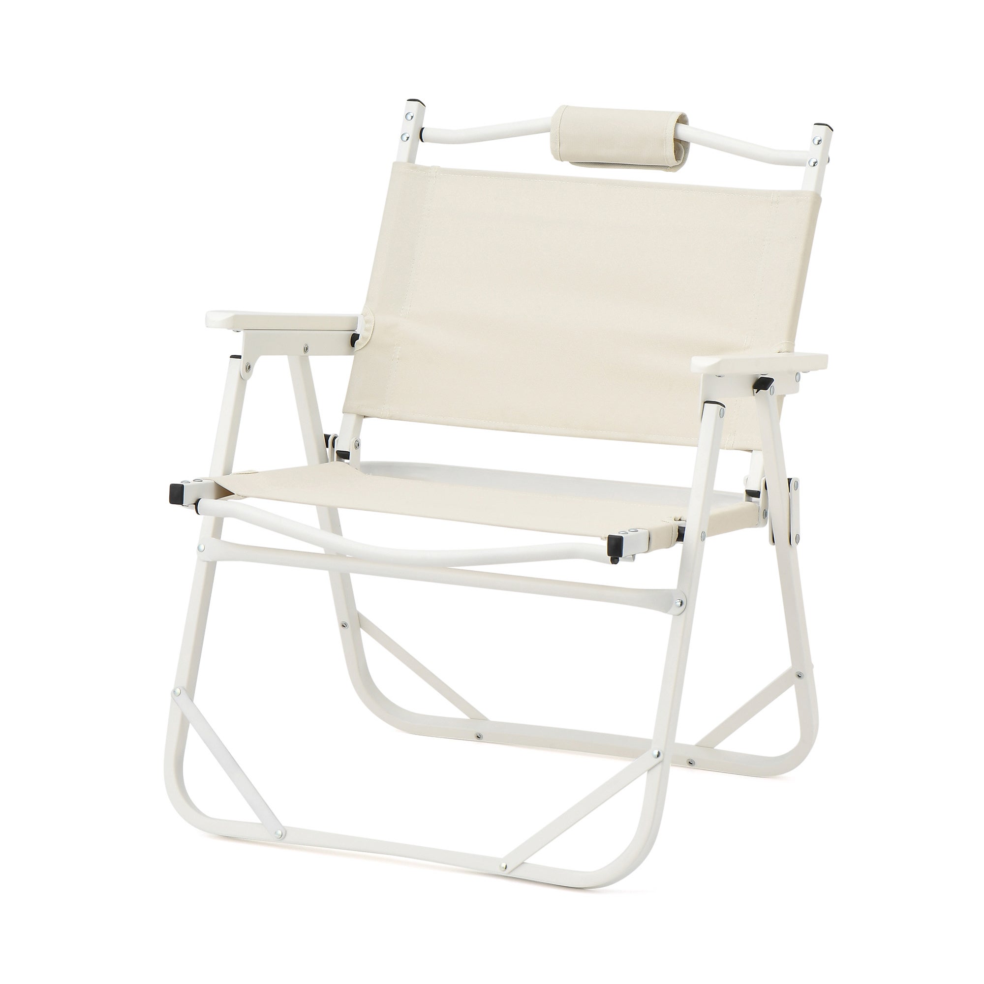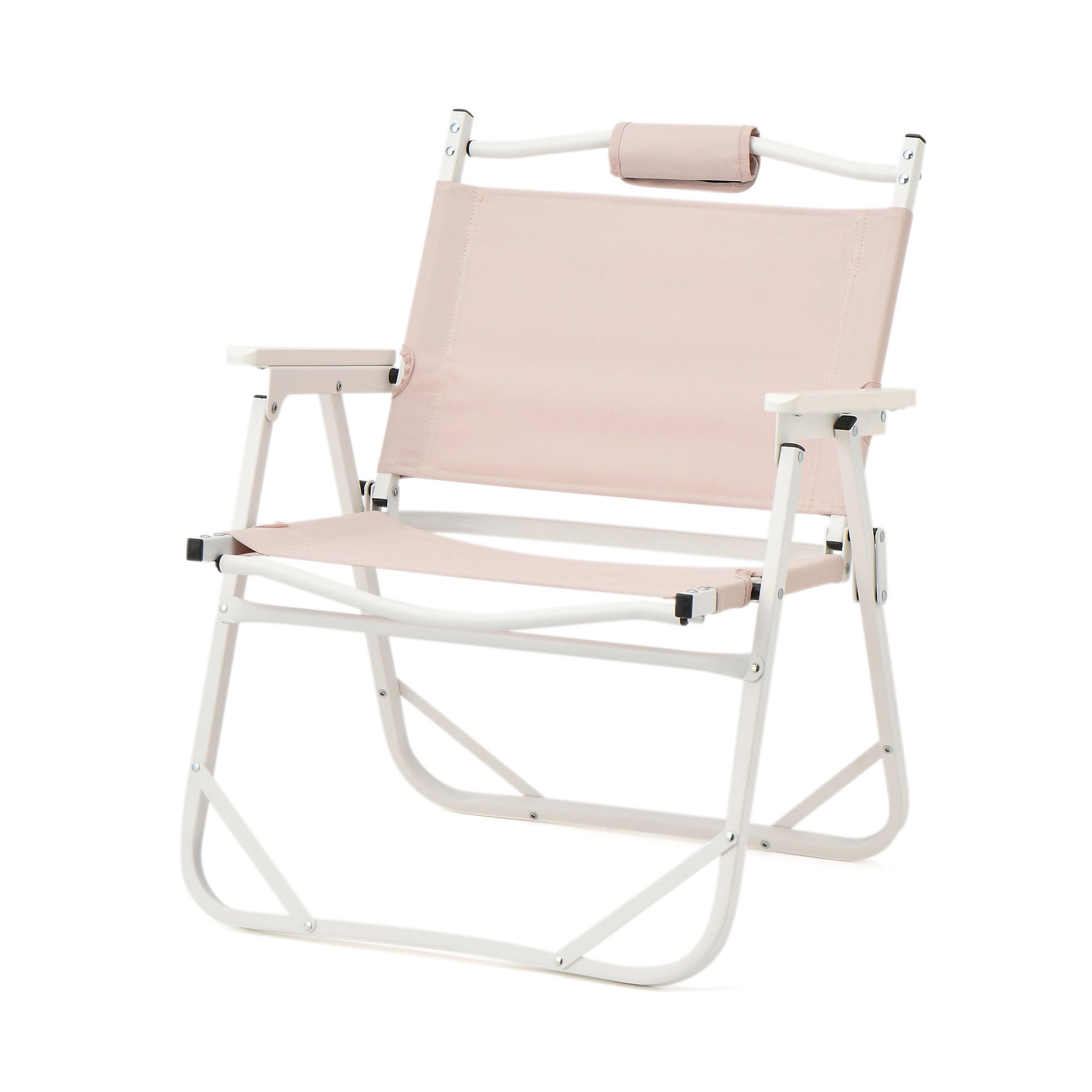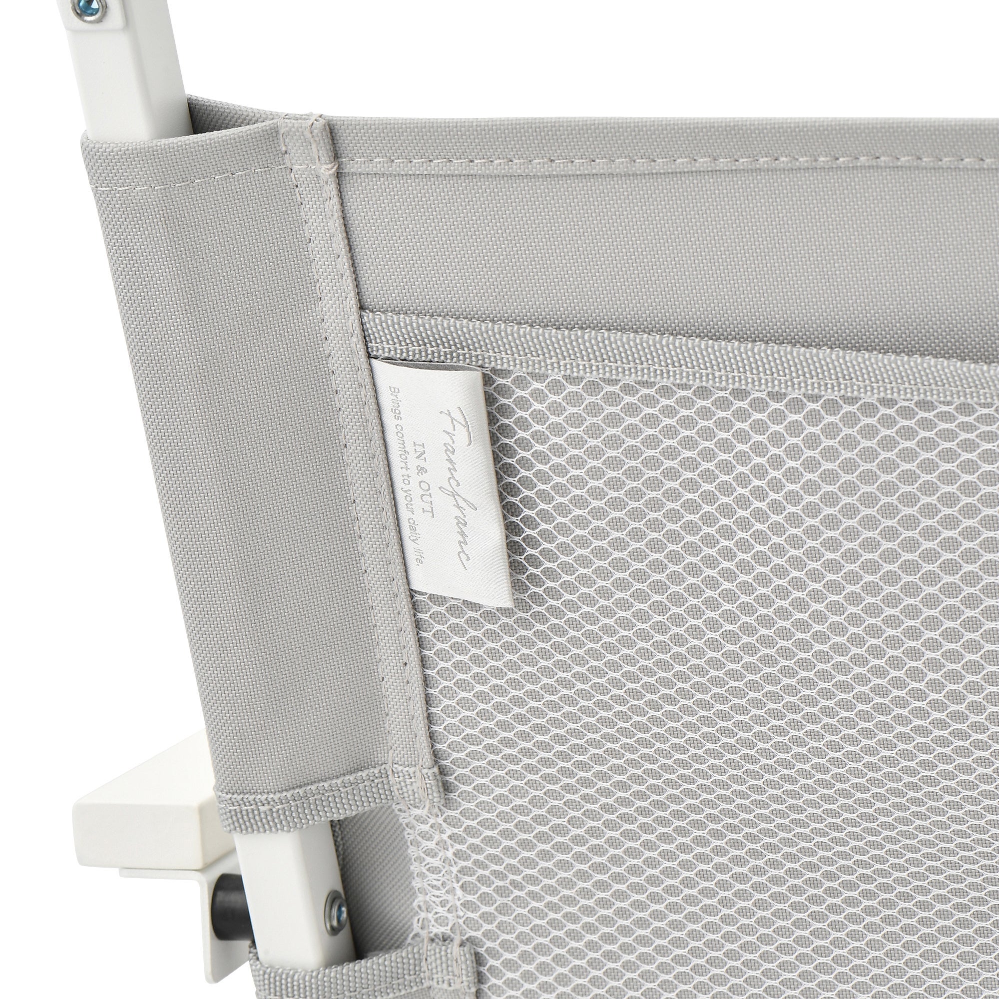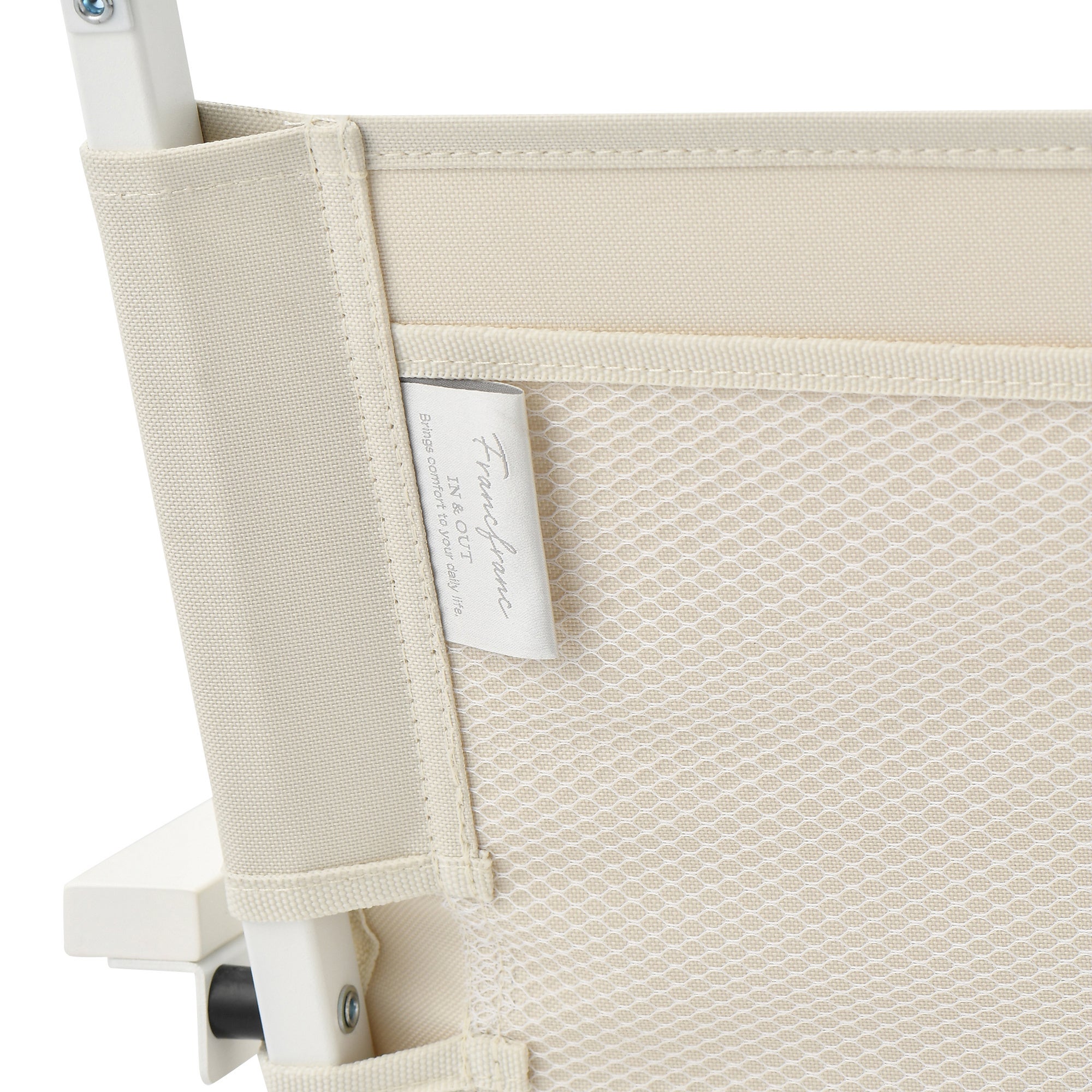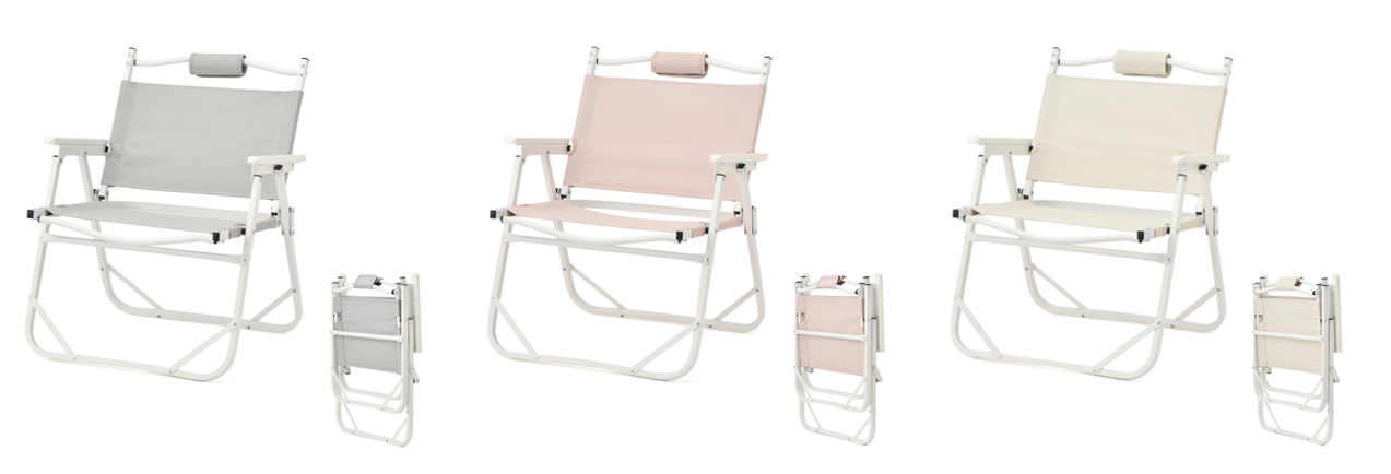 スマートな肘掛けがあり、リラックスして座ることができます。背もたれと座面を中央に引き寄せ、かんたんに折りたたんで持ち運ぶことができます。フレームの素材がアルミニウムで軽量なので、女性でも軽々お使いいただけるのが嬉しいポイントです。また、背面にはA4サイズが収納できるメッシュ素材のポケットが付いており、ちょっとした小物を収納できます。インテリアとしても違和感なくお使いいただけるよう、ホワイトカラーのフレームと落ち着いたカラーの張地を組み合わせました。日々の暮らしを快適にという想いを込めて『Brings comfort to your daily life』のメッセージをさりげなくタグにデザインしています。ちょっとしたスペースやべランピング、ピクニックやキャンプなど様々なシーンで活躍してくれるアイテムです。