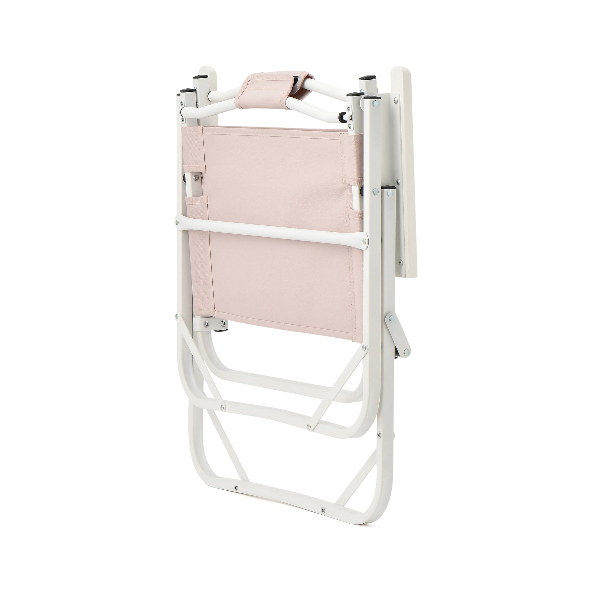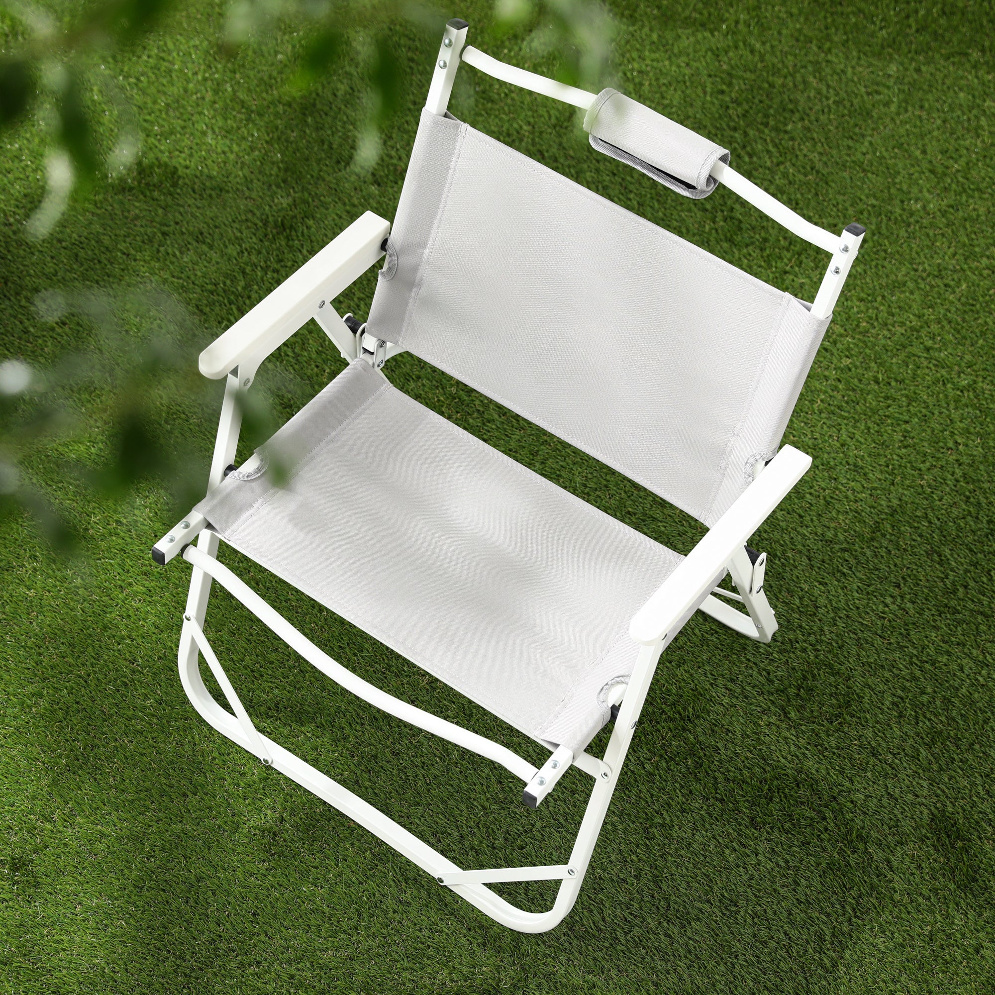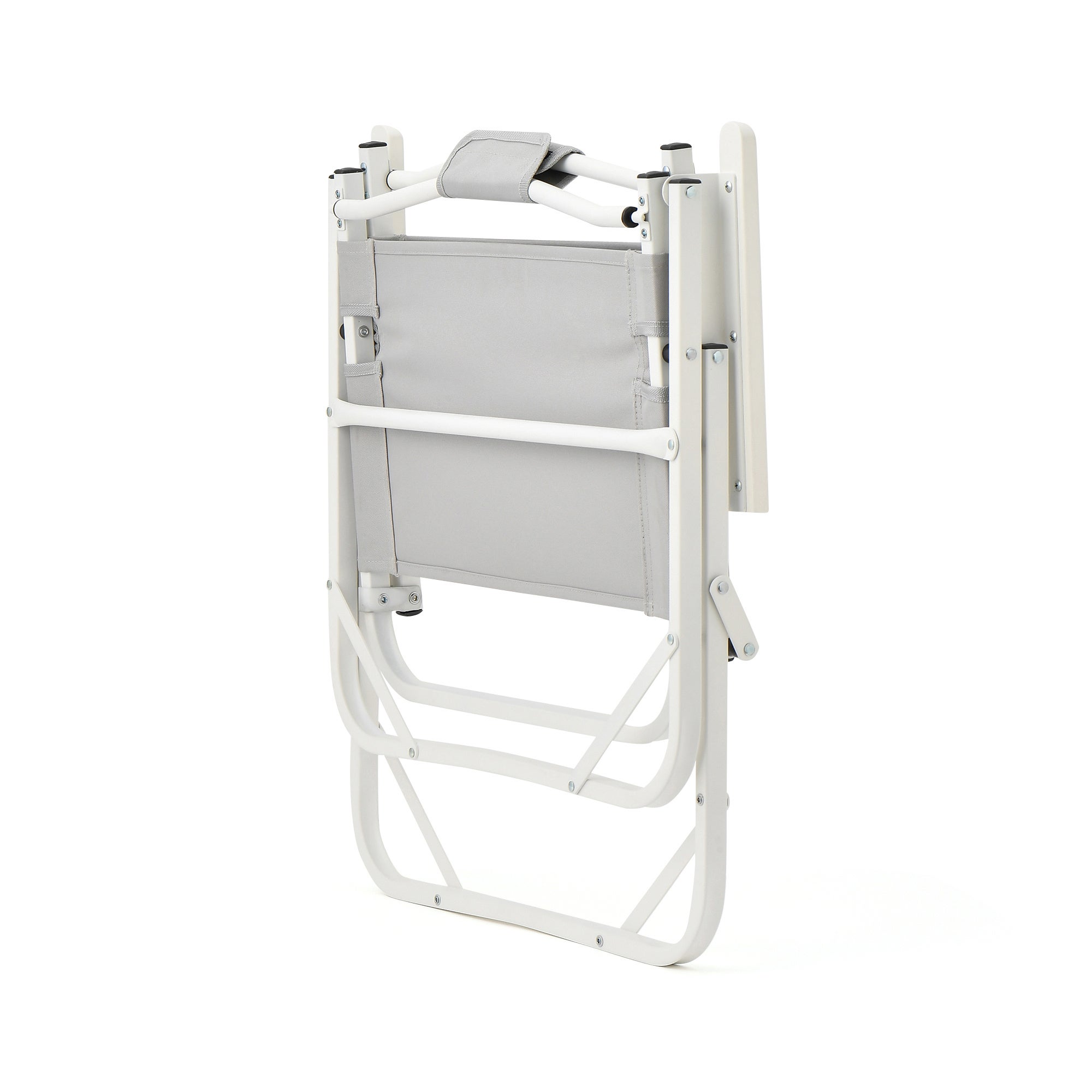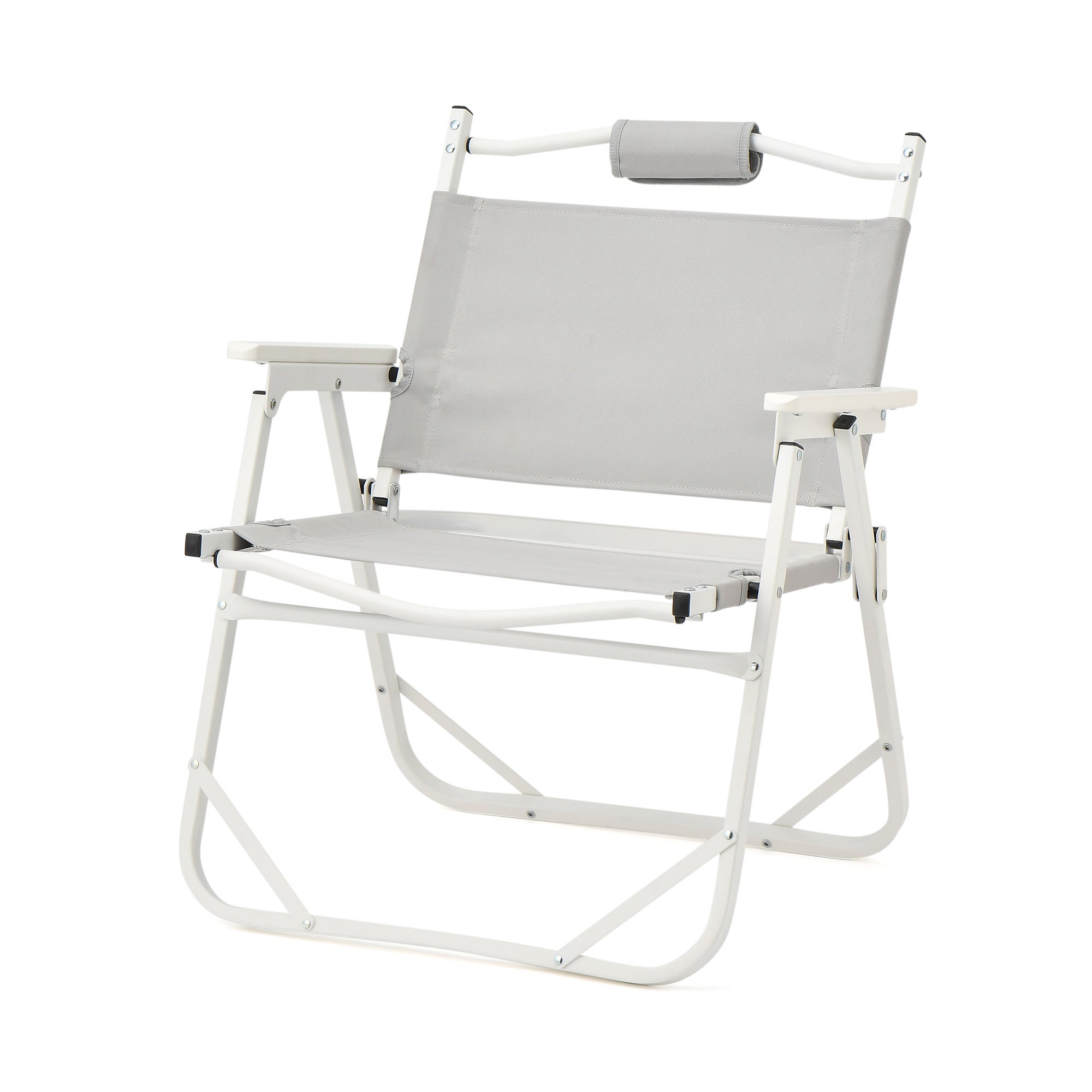 スマートな肘掛けがあり、リラックスして座ることができます。背もたれと座面を中央に引き寄せ、かんたんに折りたたんで持ち運ぶことができます。フレームの素材がアルミニウムで軽量なので、女性でも軽々お使いいただけるのが嬉しいポイントです。また、背面にはA4サイズが収納できるメッシュ素材のポケットが付いており、ちょっとした小物を収納できます。インテリアとしても違和感なくお使いいただけるよう、ホワイトカラーのフレームと落ち着いたカラーの張地を組み合わせました。日々の暮らしを快適にという想いを込めて『Brings comfort to your daily life』のメッセージをさりげなくタグにデザインしています。ちょっとしたスペースやべランピング、ピクニックやキャンプなど様々なシーンで活躍してくれるアイテムです。