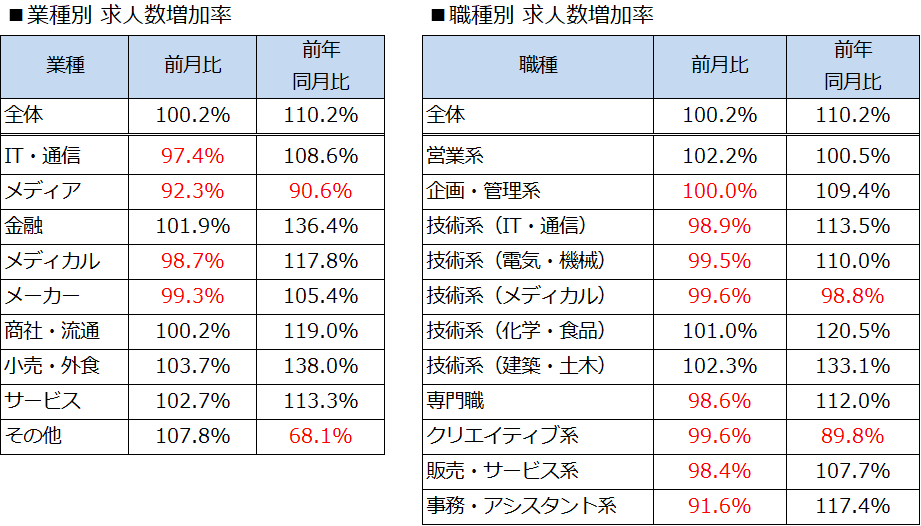 業種別では、「その他」以外の8業種のうち「金融」「商社・流通」「小売・外食」「サービス」の4業種で求人数が増加しました。求人の増加率が特に高かったのは、「小売・外食」(前月比103.7%)、「サービス」(前月比102.7%)でした。職種別では、11職種のうち「営業系」「技術系(化学・食品)」「技術系(建築・土木)」の3職種で求人数が増加しました。求人の増加率が特に高かったのは、「技術系(建築・土木)」(前月比102.3%)、「営業系」(前月比102.2%) でした。