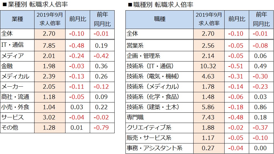 2019年9月の転職求人倍率は、前月比-0.10ポイントの2.70倍となりました。求人数は前月比100.2%、前年同月比 110.2%となりました。転職希望者数は前月比103.9%、前年同月比110.9%でした。