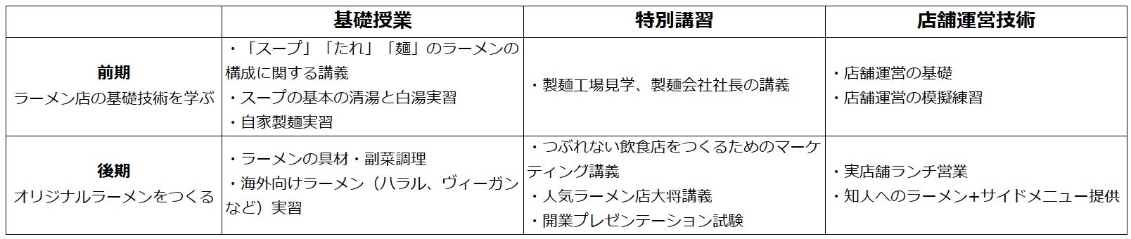 麺とスープと具材というシンプルながら奥深いラーメンの世界を、わずか1カ月で学べる独自のカリキュラムが決定しました。海外でも役立つスキルを身に付けられるよう、ハラルやヴィーガンに対応したラーメンづくりの授業を導入します。