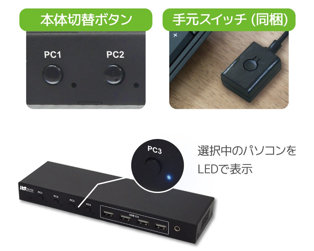 また、選択中のパソコンがひと目で分かるLEDも搭載しています。