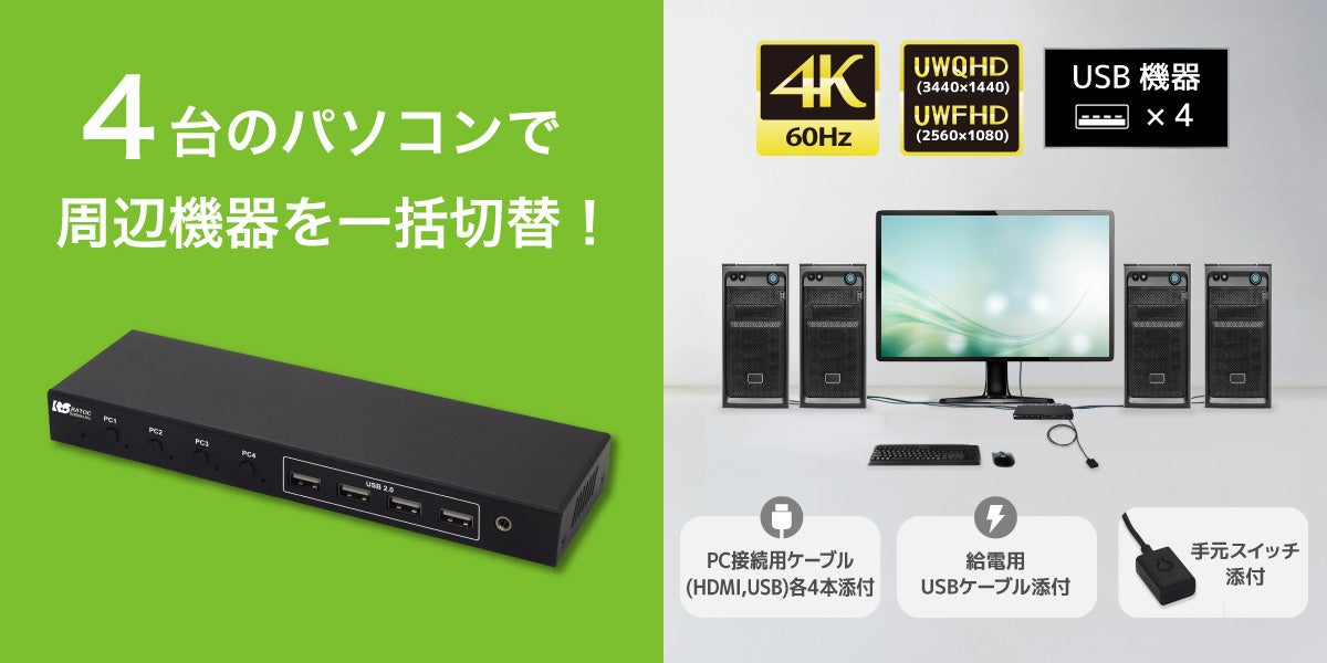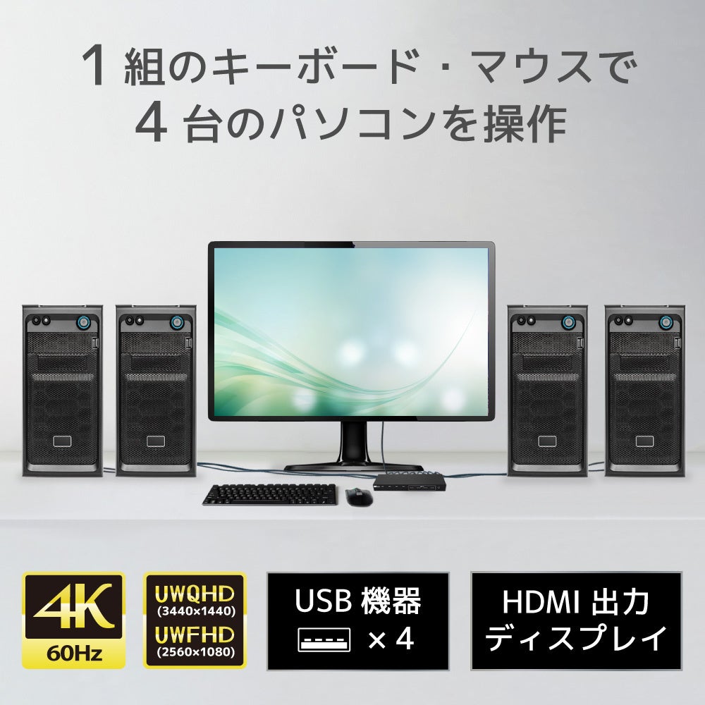 PC4台で周辺機器を一括切替!4K60Hz対応HDMIパソコン切替器、2月中旬発売
