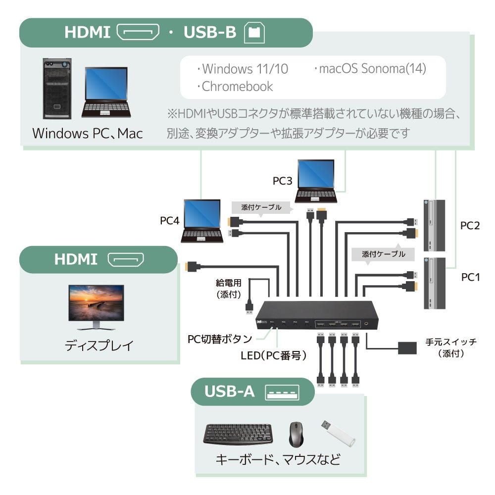 本製品はHDMI端子とUSB端子が搭載されたパソコンに対応。OSはWindows、Mac、Chromebookに対応しており、異なるOSのパソコン(例:WindowsとMac)でも切り替え可能です。