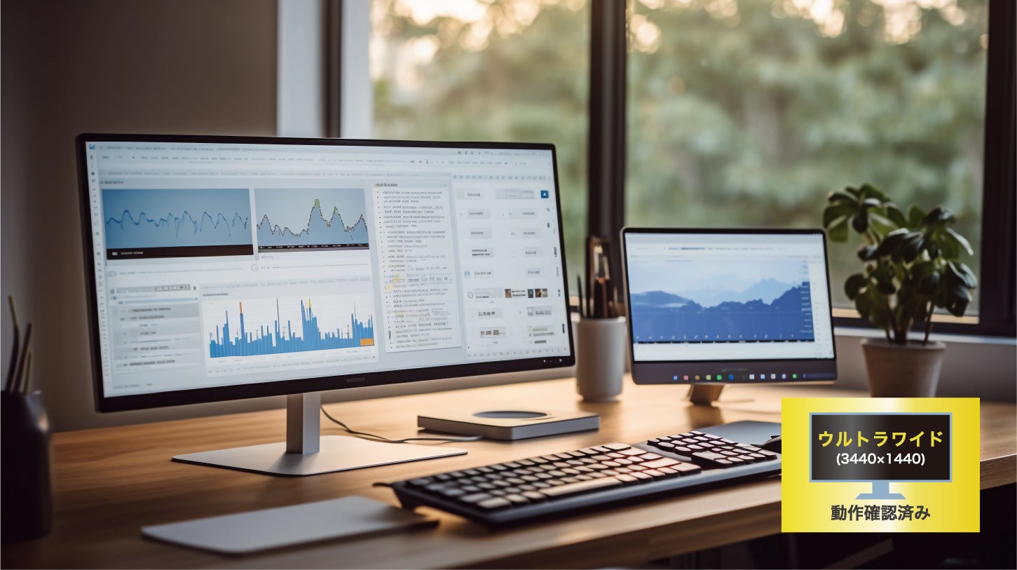 本製品は、ウルトラワイドモニターUWQHD (3440×1440)での動作を確認しています。ウルトラワイドモニターは1台で広々と使えるため、作業の効率化、デスクの省スペース化にもおすすめです。