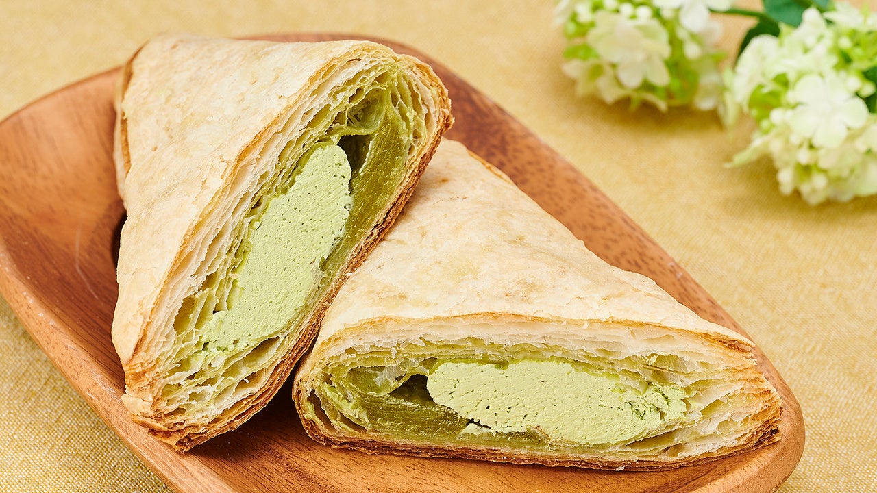 抹茶風味のパイ生地に、抹茶クリームと抹茶味のホイップを包みました。