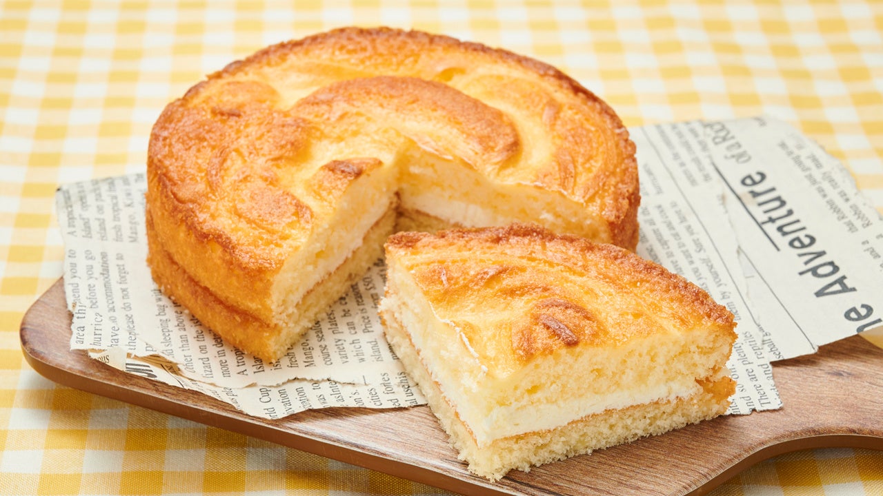 チーズペーストを乗せて焼き上げたチーズ風味のスポンジケーキに、チーズクリームをサンドしたケーキです。