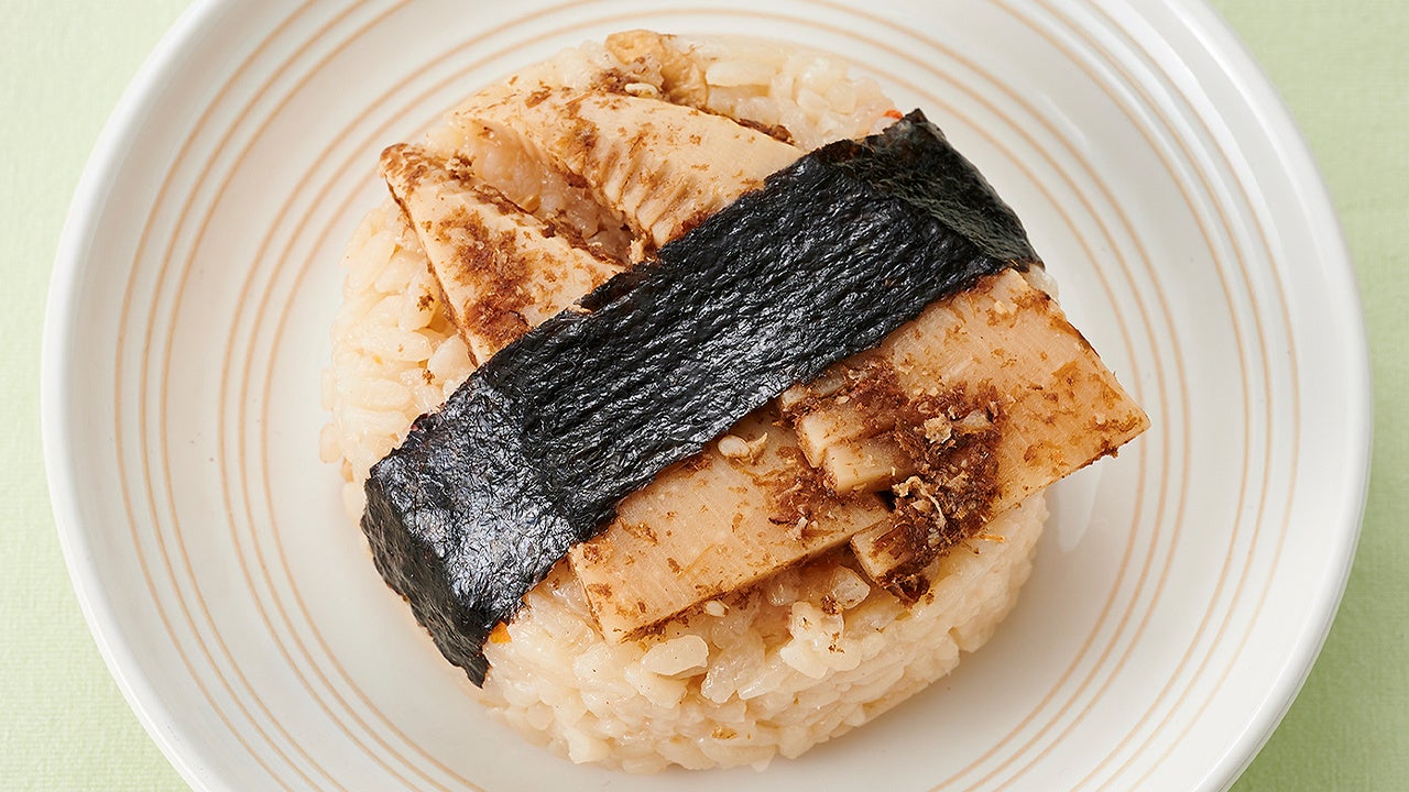 和風だしを効かせて炊いた筍ご飯に、筍の土佐煮をのせた、筍づくしのおにぎりです。