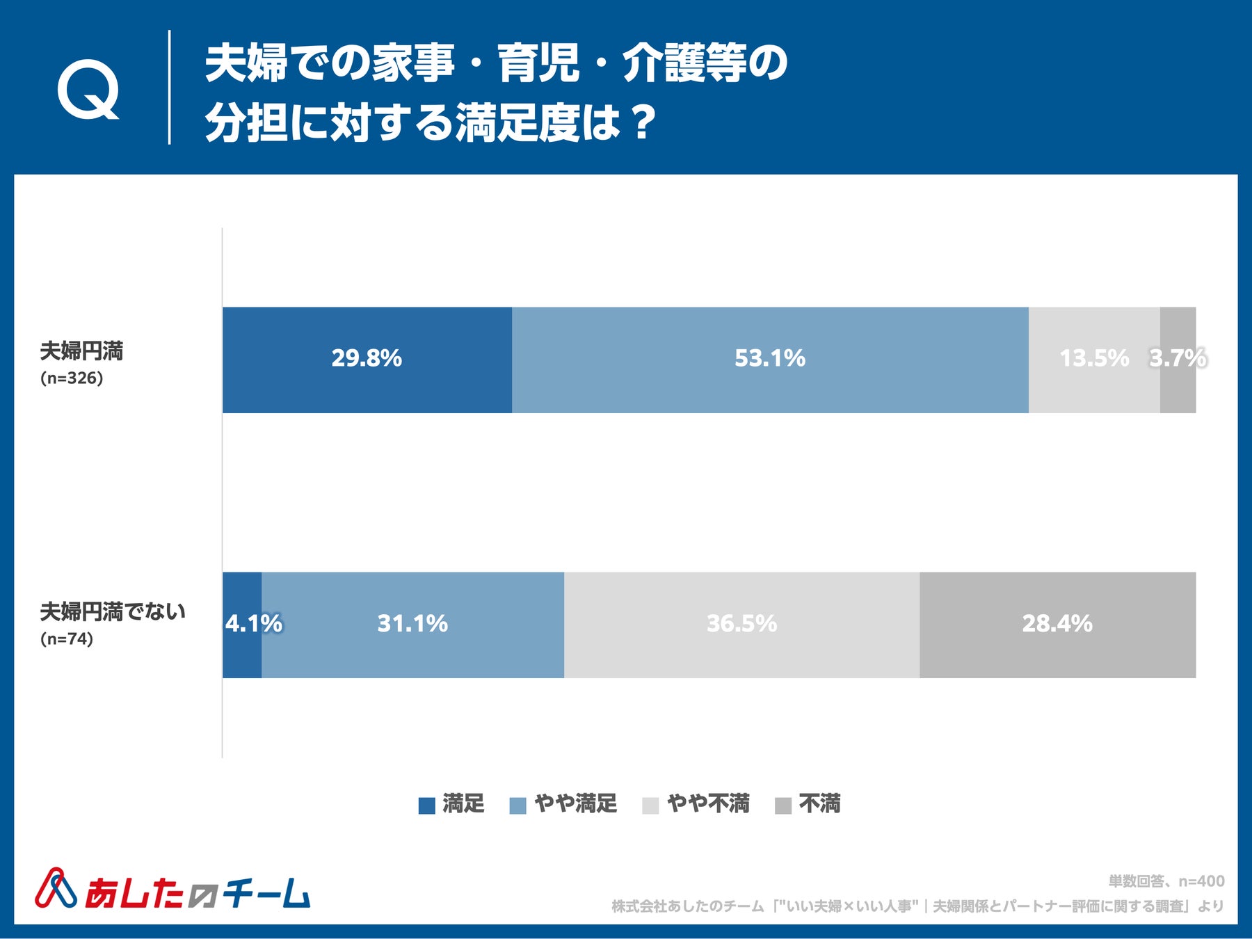 夫婦の家事・育児・介護等の分担に対する満足度を、「夫婦円満」か「夫婦円満でない」かのグループ別で見ると、夫婦円満な“いい夫婦”は「満足」29.8%、「やや満足」53.1%と、8割以上が家事・育児・介護等の分担に満足していることがわかりました。反対に「夫婦円満でない」方は「やや不満」36.5%、「不満」28.4%と、不満を感じる割合が6割以上でした。この結果から、家事・育児・介護等の分担に満足している夫婦ほど、円満な関係を築いている傾向が見られます。