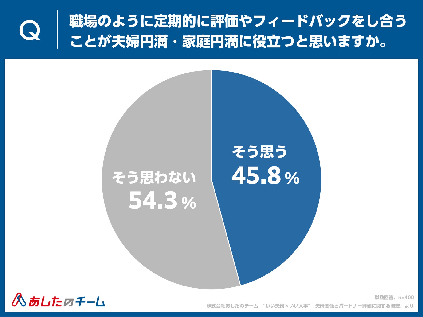 「職場のように定期的に評価やフィードバックをし合うことが夫婦円満・家庭円満に役立つと思うか」は、半数近い45.8%が「夫婦円満・家庭円満に役立つと思う」と回答しました。職場の人事評価ではチームと個人の目標をすり合わせ、フィードバックしながら成果を評価しますが、家族もひとつのチームとすれば、夫婦で認識や方向性を合わせ、ズレがないかを定期的に確認し合うことが重要といえるでしょう。長く一緒にいることでつい自分本位になりがちな夫婦関係も、評価やフィードバックで改善していくことがあるかもしれません。「頑張ってくれてはいるけど、そうじゃない」といったすれ違いも少なくなるでしょう。