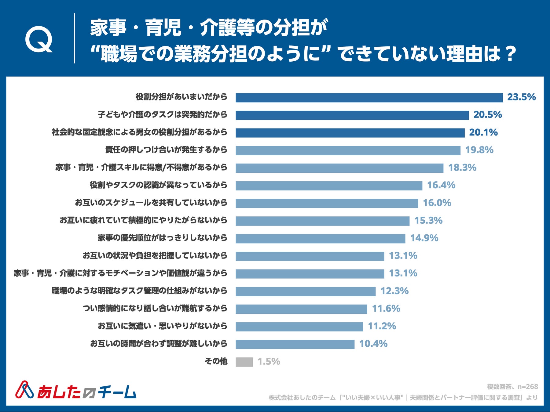 Q. 夫婦の家事・育児・介護等の分担が“職場での業務分担のように”スムーズにできていない理由をお答えください。(複数回答、n=268)