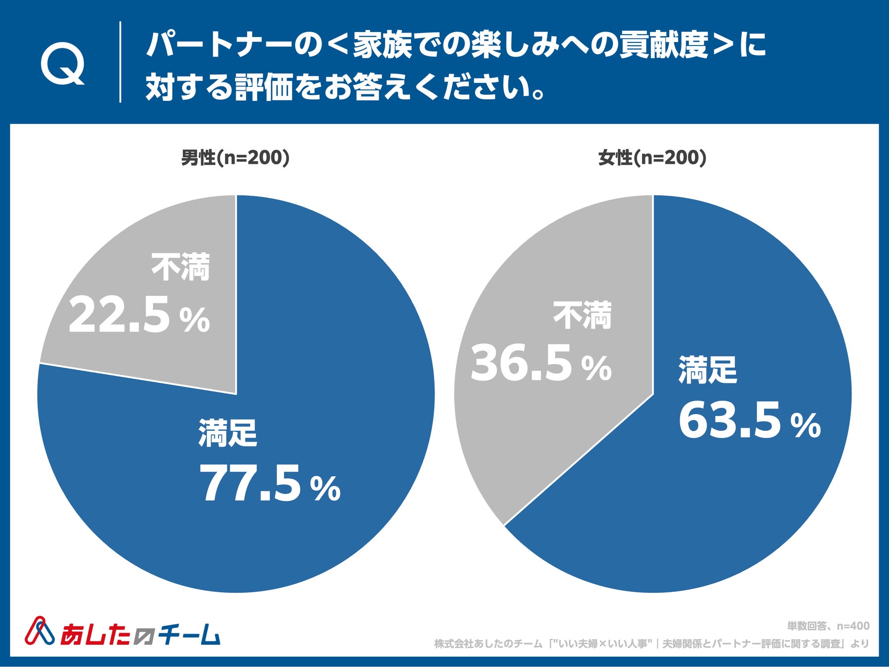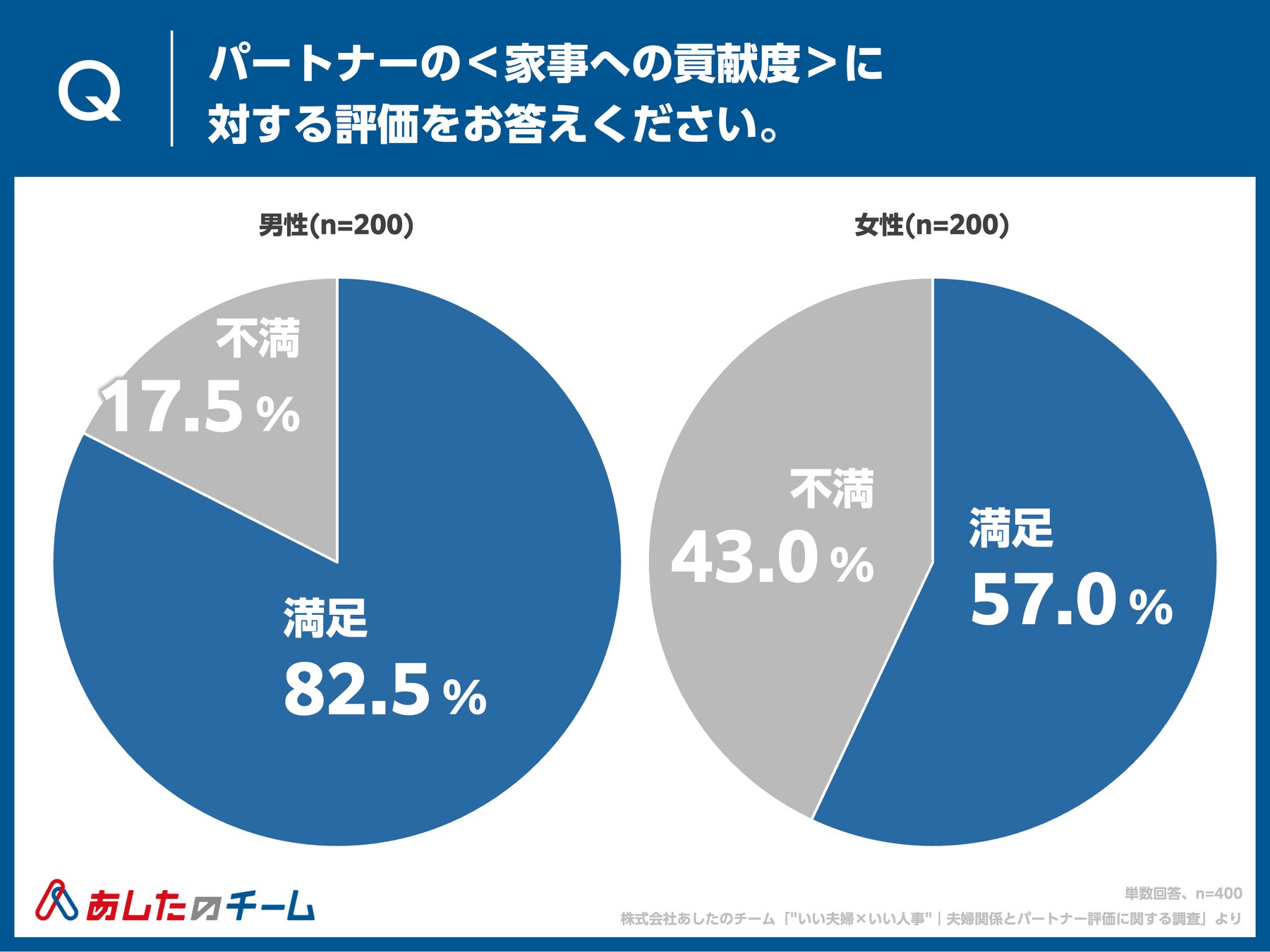 「家事」「家族での楽しみ」「世帯年収」に満足?or不満? パートナーへの評価が明らかに。男性はほぼ8割が「満足」と答えるなか、女性の評価はシビアな結果に。