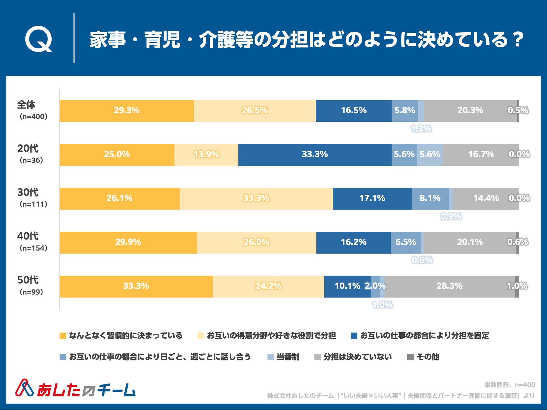 20代は「お互いの仕事の都合」、30代は「お互いの得意分野や好きな役割で」、