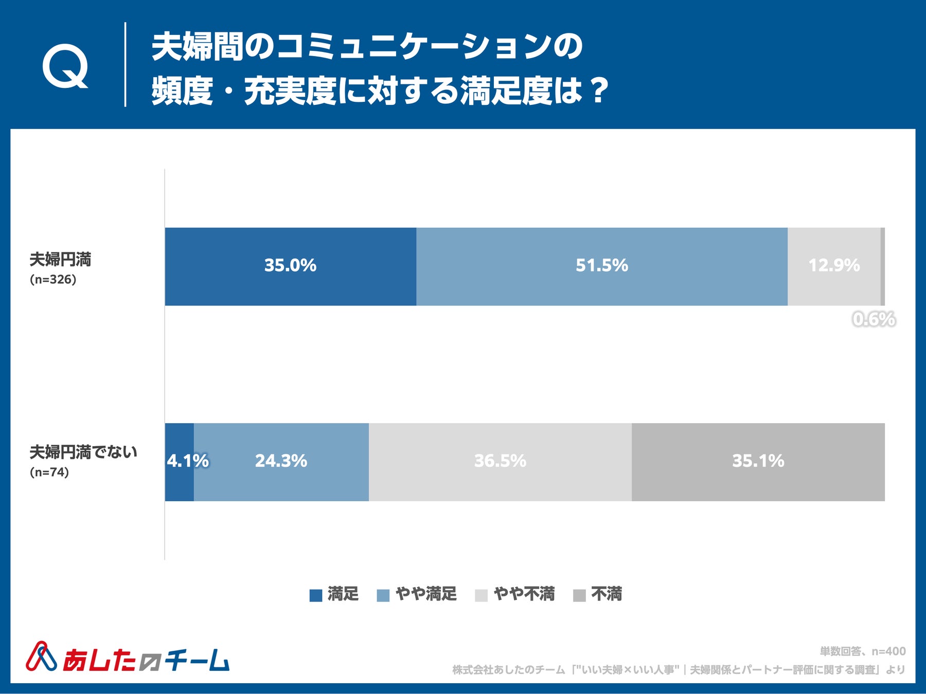 夫婦間のコミュニケーションの頻度・充実度に対する満足度は、夫婦円満な“いい夫婦”は「満足」35.0%、「やや満足」51.5%と、満足の割合が9割にとどきそうです。反対に「夫婦円満でない」方は、「やや不満」36.5%、「不満」35.1%と不満の割合が7割を超えています。夫婦間のコミュニケーションの頻度・充実度と夫婦円満度との相関が顕著に確認できる結果となりました。
