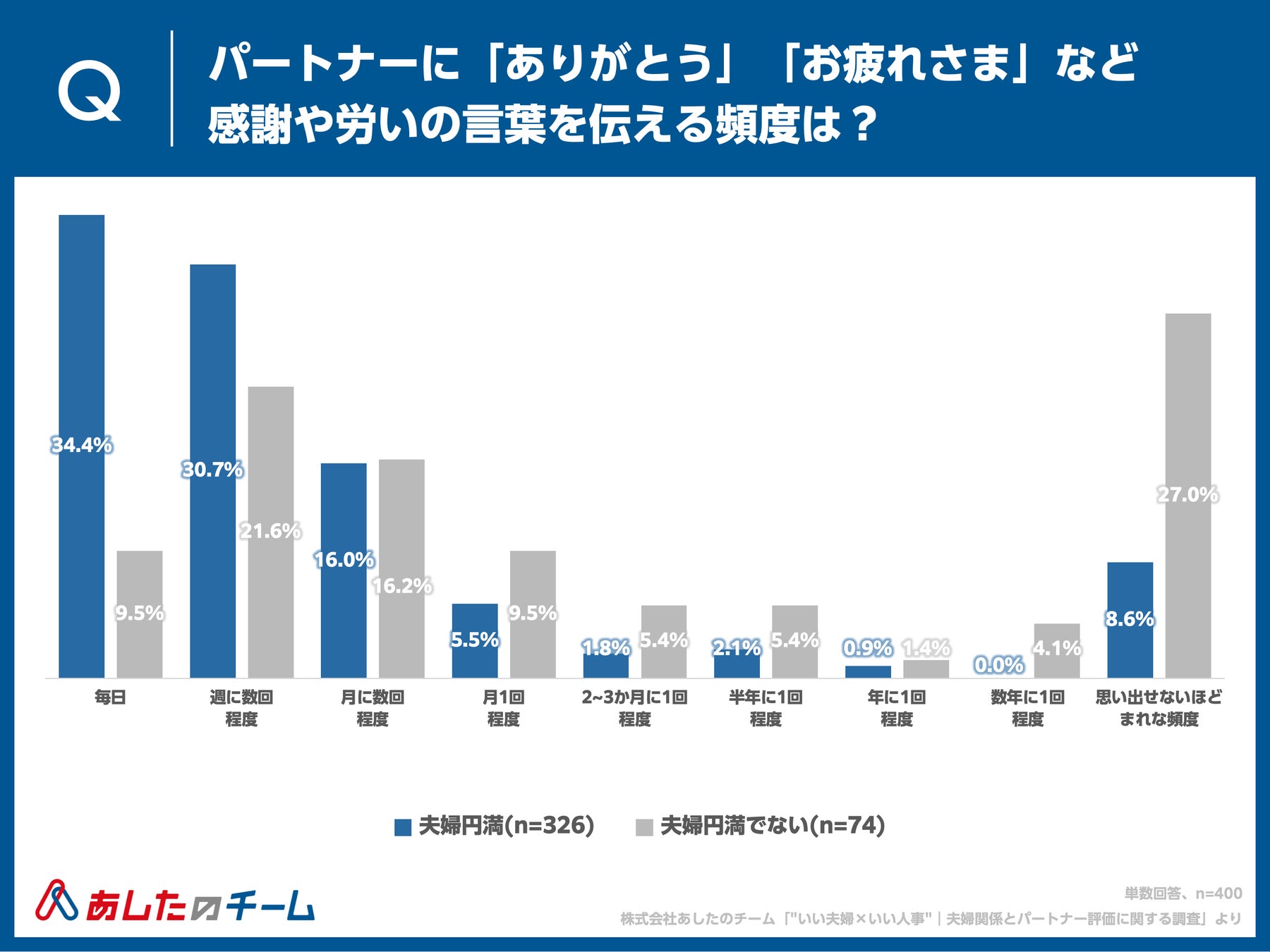 パートナーに「ありがとう」「お疲れさま」など感謝や労いの言葉を伝える頻度を聞きました。夫婦円満な“いい夫婦”は、3組に1組となる34.4%が「毎日」感謝や労いの言葉を伝えていることがわかりました。一方、「夫婦円満でない」と回答した方では「思い出せないほどまれな頻度」が27.0%にのぼりました。日常的にパートナーに感謝や労いの言葉を伝えることが夫婦円満の秘訣なのかもしれません。