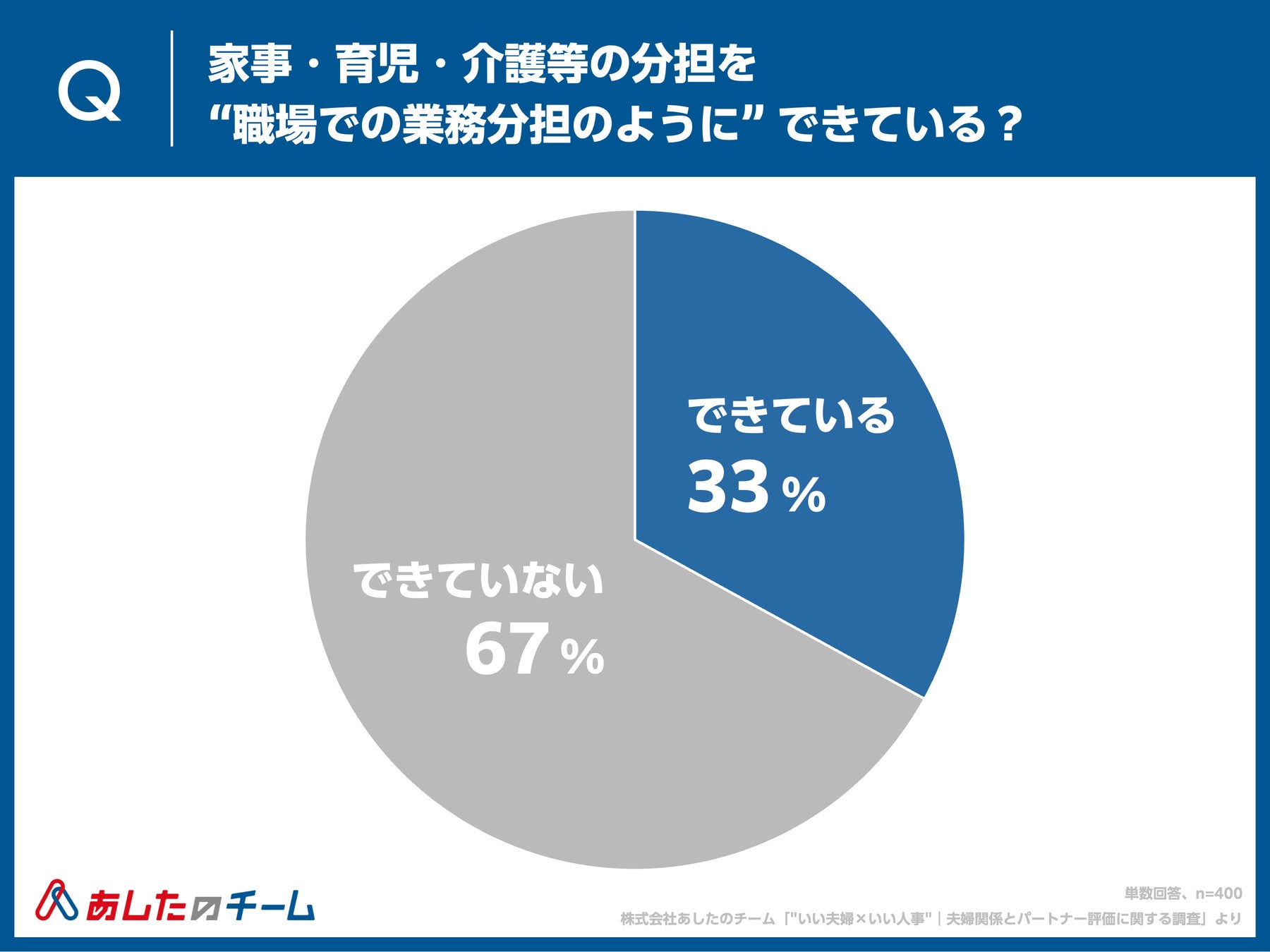 共働き夫婦の家事・育児・介護等の分担について聞きました。職場では効率よく正確に業務を遂行するためにチーム内で業務分担をして進めていきますが、家庭での分担はどうでしょうか。夫婦の家事・育児・介護等の分担を、“職場での業務分担のように”スムーズにできているか聞いたところ、「できている」33.0%、「できていない」67.0%という結果でした。