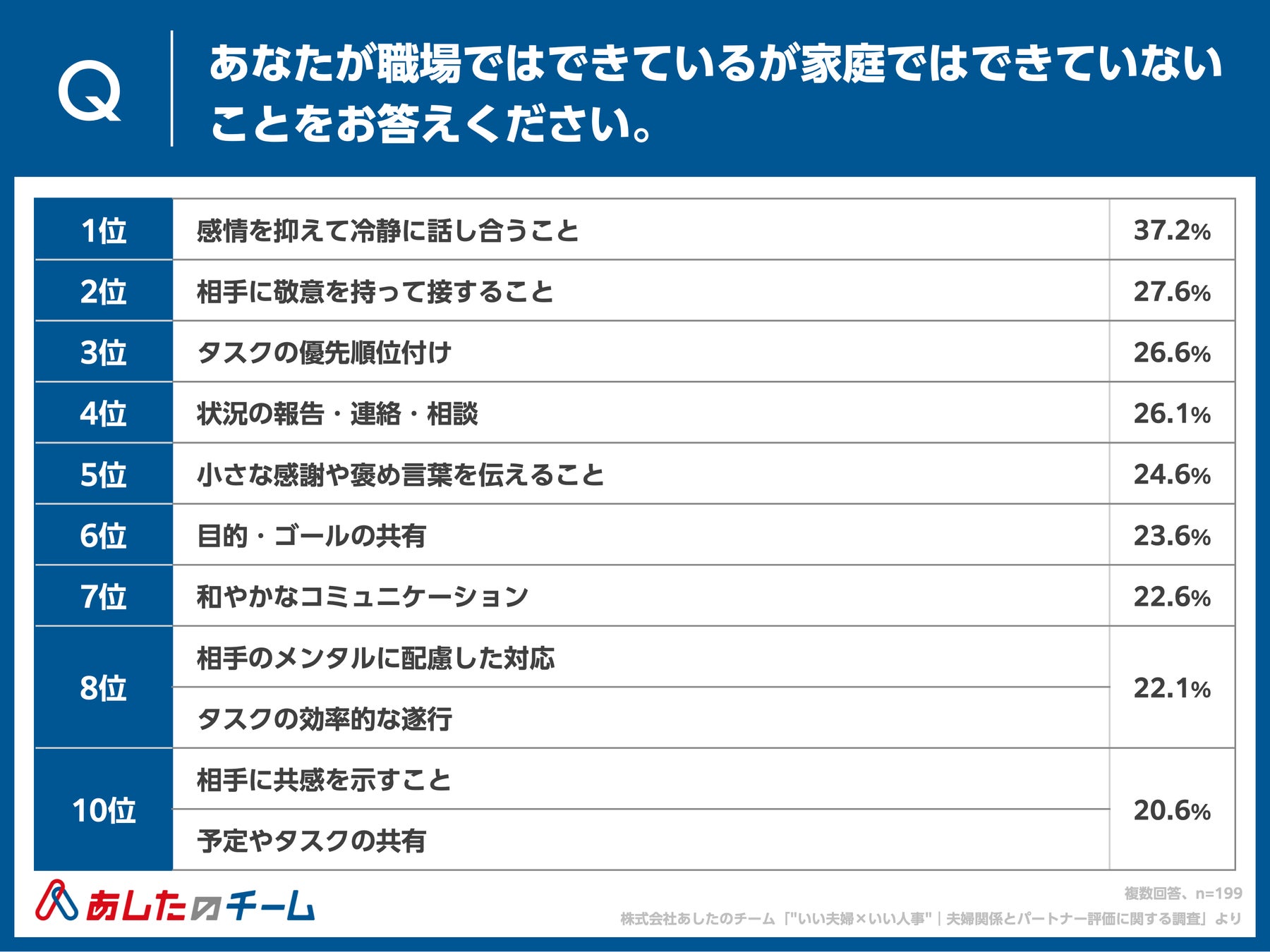 職場ではできているが家庭ではできていないこと、1位は「感情を抑えて冷静に話し合うこと」。職場のように定期的に評価やフィードバックをし合うことが、夫婦円満に役立つことも!?