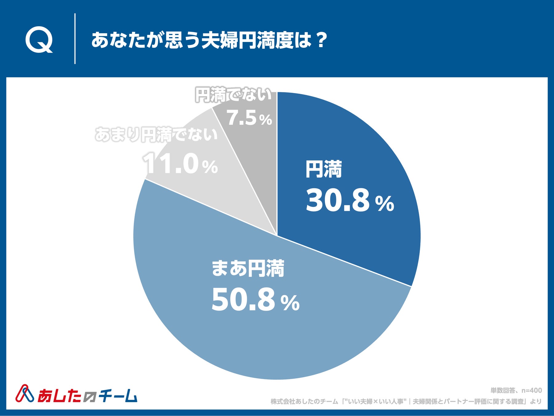 夫婦円満度を聞いたところ、「円満」30.8%、「まあ円満」50.8%をあわせて、夫婦円満だと感じている方が8割以上という結果になりました。