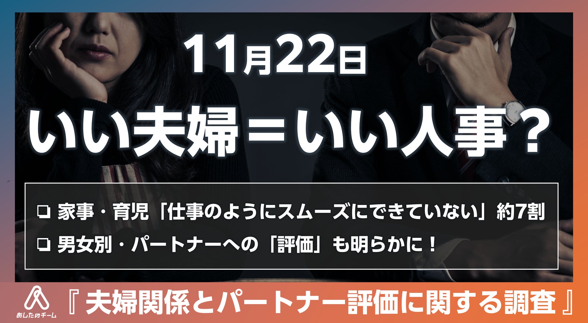 11月22日は、「いい夫婦の日」であるとともに、「“いい人事”の日」※です。人事評価制度の構築・運用・クラウド化で “人と組織の成長” を支援する株式会社あしたのチーム(本社:東京都中央区、代表取締役社長 CEO:赤羽博行)は、20代~50代の既婚で夫婦共働きの男女を対象に、「夫婦関係とパートナー評価に関する調査」を行いました。