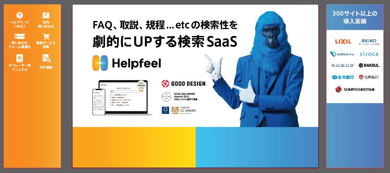 なお、今回が検索型AI-FAQ「Helpfeel」のイメージキャラクター HelpApe(ヘルプエイプ)をあしらったブースデザインでの初出展となります。皆様のご来場をお待ちしております。