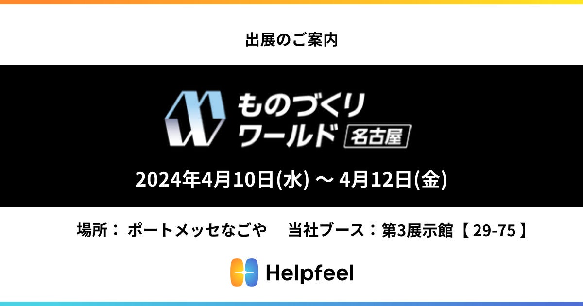 株式会社Helpfeel(京都府京都市、代表取締役/CEO:洛西 一周、以下 当社)は、2024年4月10日(水)〜4月12日(金)にポートメッセなごやで開催される展示会「第9回ものづくりワールド名古屋」に出展することをお知らせします。